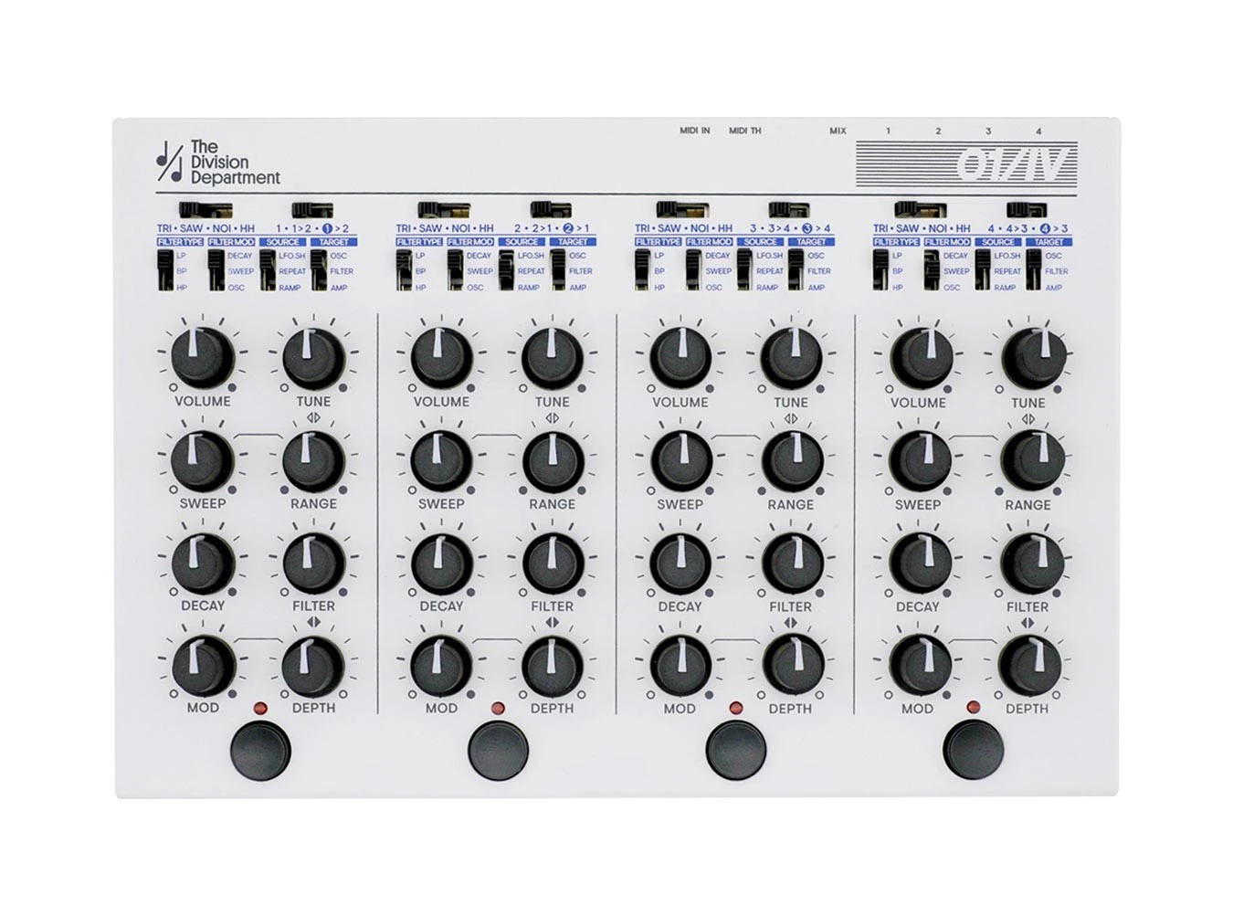 The Division Department 01/IV is a four-channel analog drum synthesizer perfect for creating a wide palette of sounds with hands-on control. It features four identical channels which each can synthesize a wide variety of drum sounds from kicks, toms, cymbals, hi-hats, snares, or even bass lines. The channels can also be layered, combined, and modulate each other in pairs for FM operation.