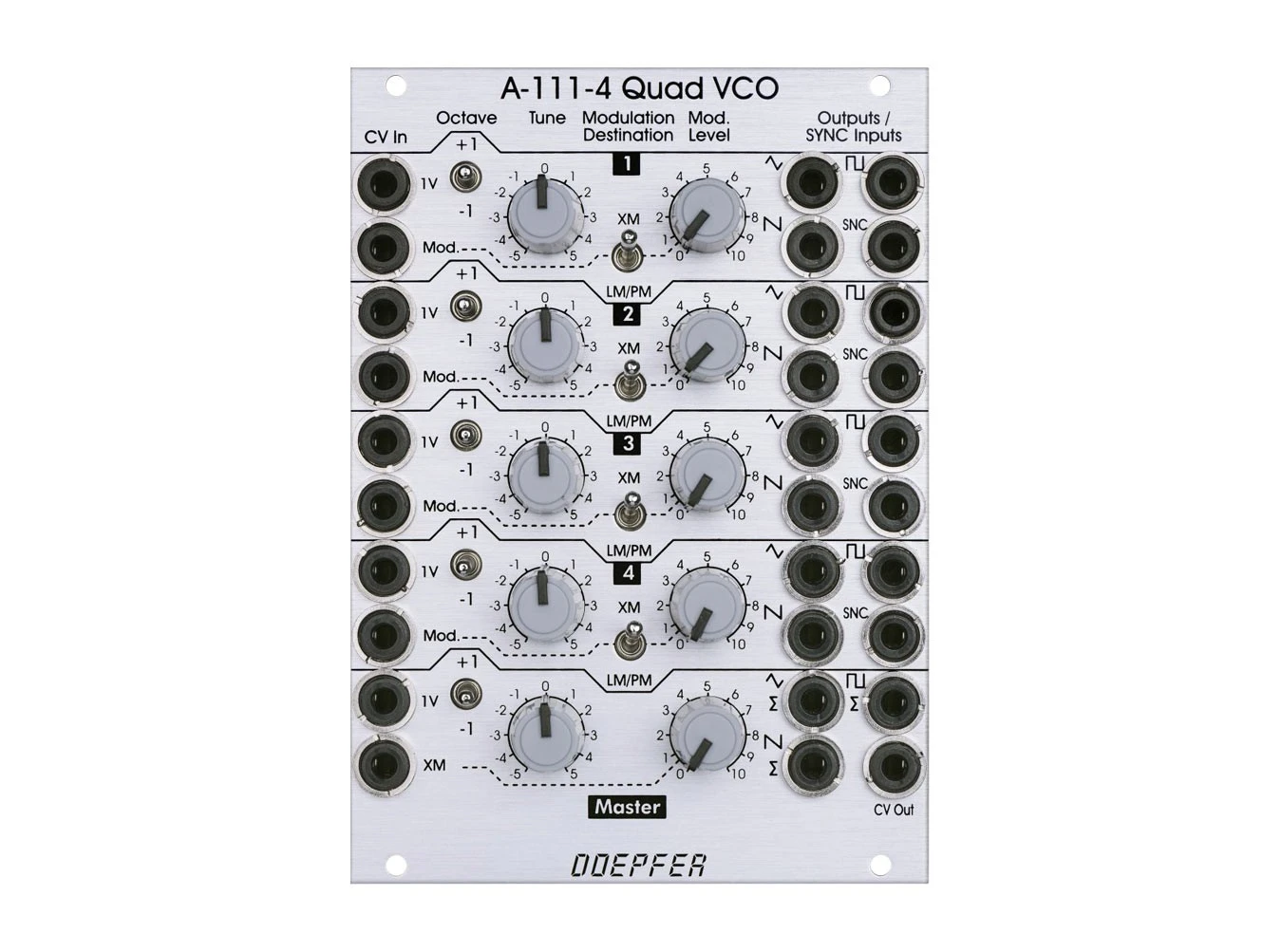 Doepfer’s Quad Precision VCO takes the CEM3340-based triangle core VCO found in the A-111-3, multiplies it by four, and adds a powerful master modulation and mix output section. This configuration makes the A-111-4 ideal for polyphonic patches, fat bass sounds and deep FM tones alike!