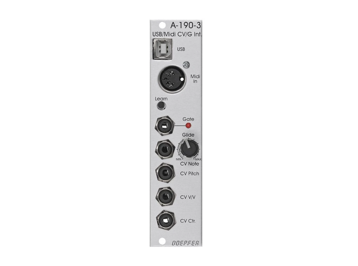 The A-190-3 module is essentially the Eurorack version of the Dark Link sequencer. It converts USB/MIDI signals to analog CV/Gate signals and features four CV outputs with a single Gate output. The A-190-3 differs from its predecessor, the A-190-2, with the addition of USB functionality.
