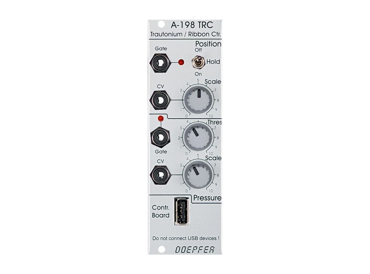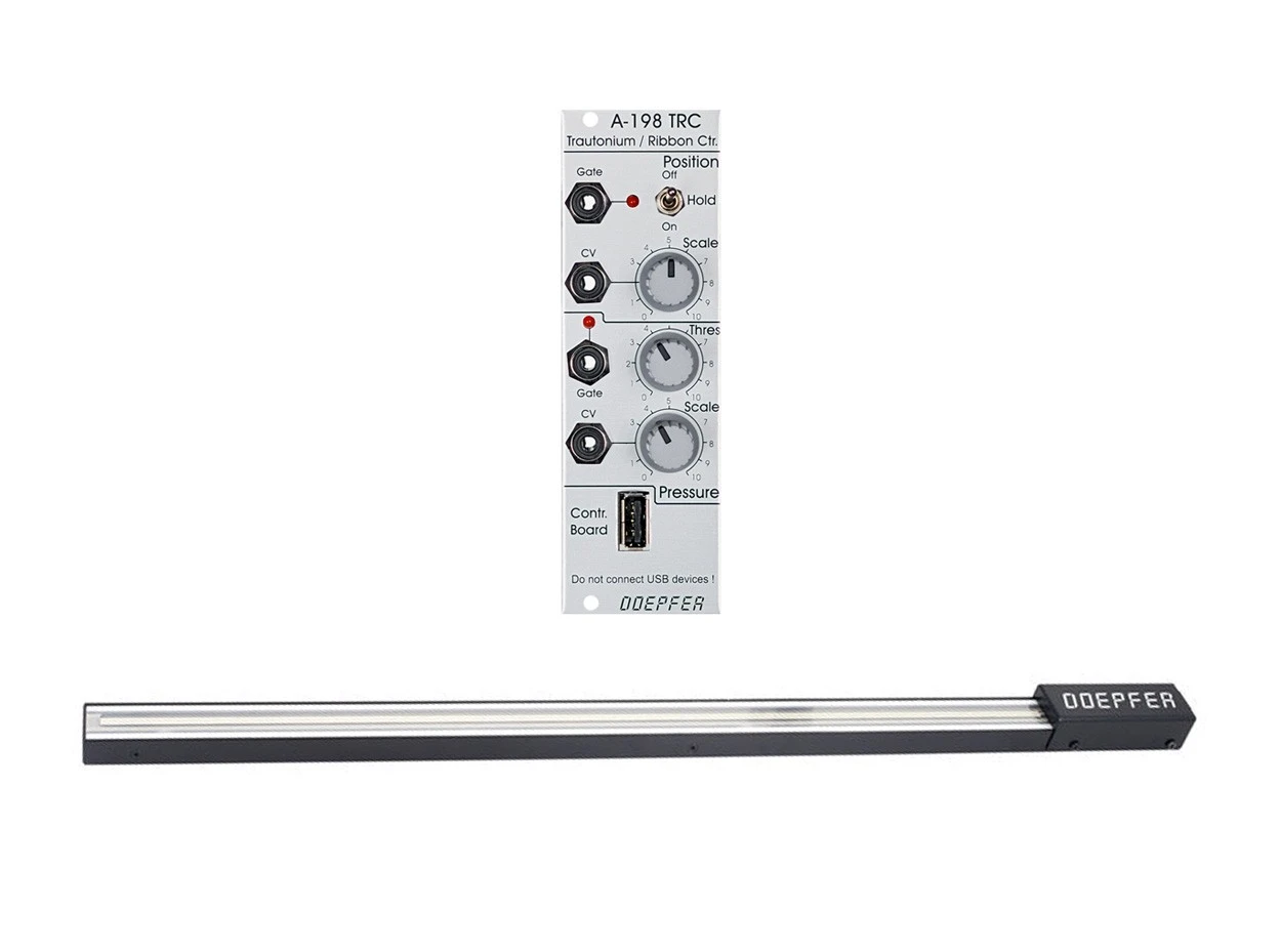 The A-198 module is a versatile ribbon controller with both a linear position sensor and a pressure sensor. When users touch the sensor, the module generates CV for the CV1 output; there is a dedicated potentiometer for scaling the signal and a hold switch that freezes the CV after one removes their finger. When the hold parameter is switched to “off”, the module generates a gate signal.