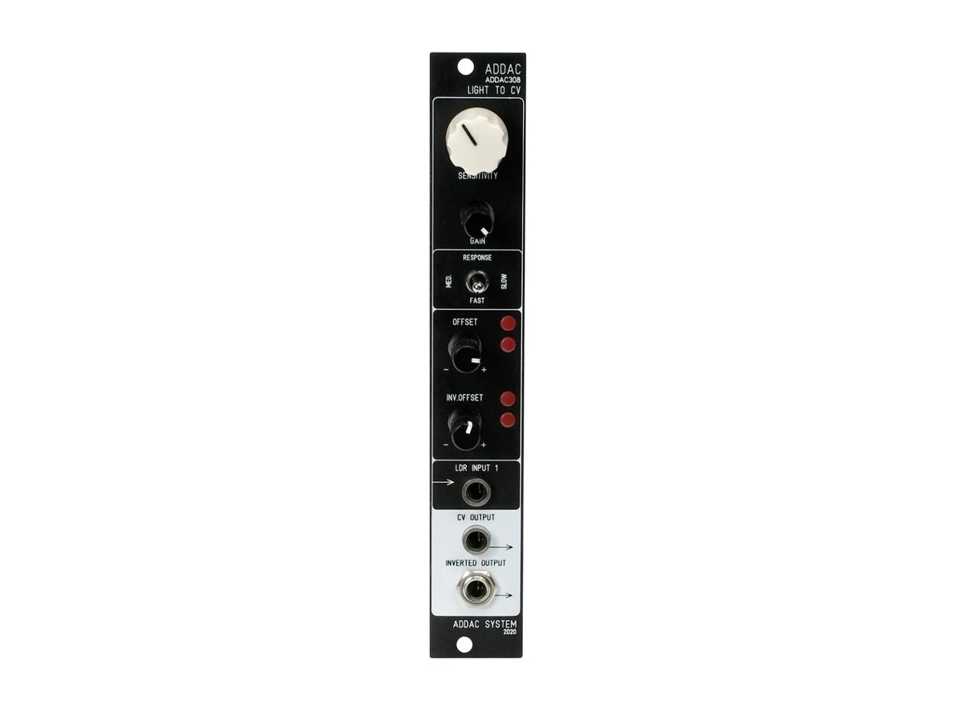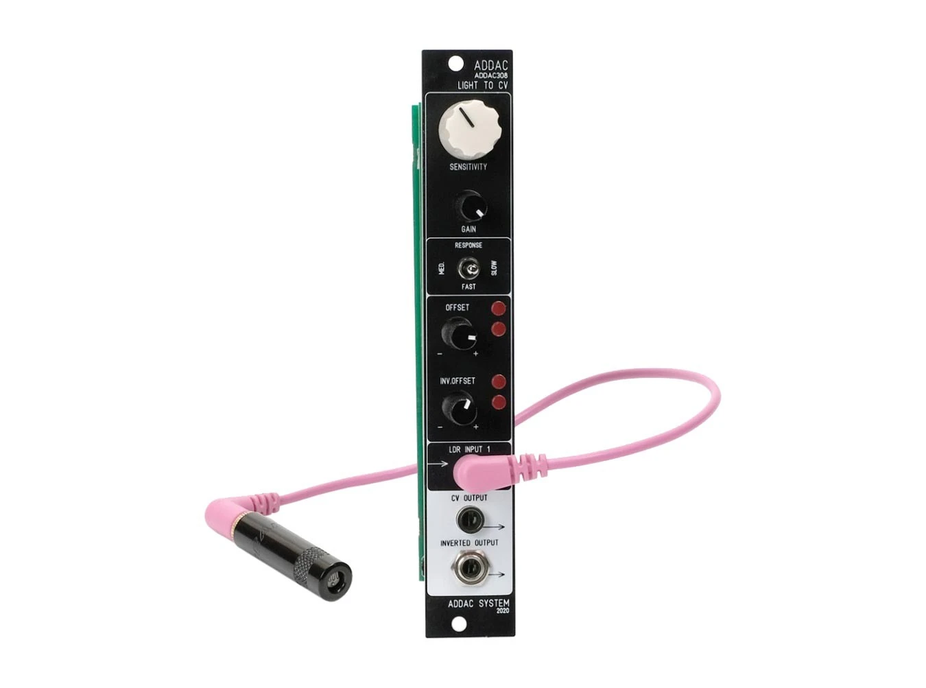 Explore the world of environmental CV modulations with the 308 Light to CV module from ADDAC. This clever device includes an LED and LDR (light-dependent resistor) housed in patch cable compatible housings, so they can be set up anywhere that’s convenient for your setting. With the LDR connected to the sensor input, Sensitivity sets the response to lights. From there, the module offers Gain and independent Offset controls for the CV and inverted outputs, and there’s also a switch to determine the slew response rate to changes in light. Illuminate your patches with ADDAC’s 308 Light to CV module.