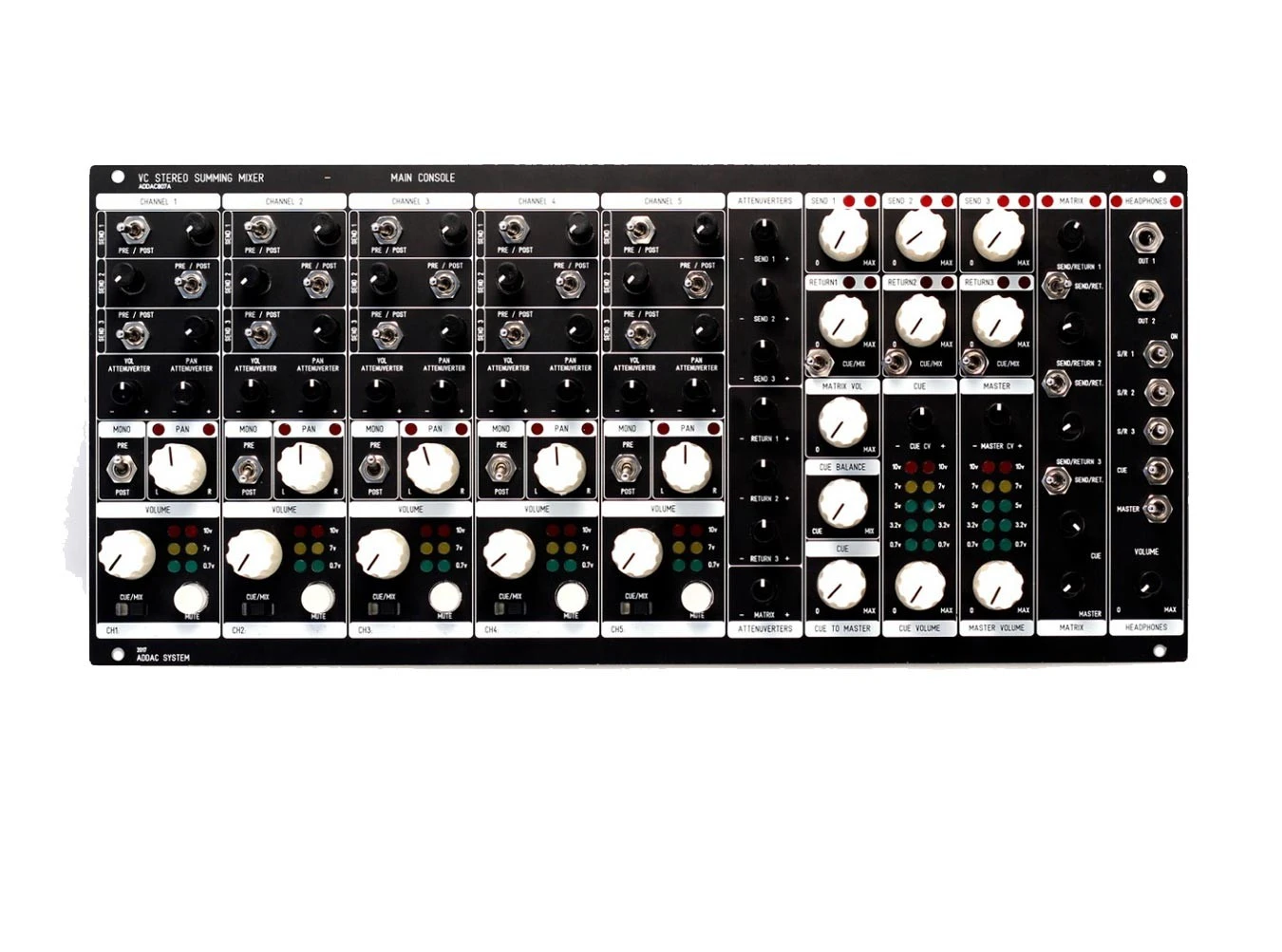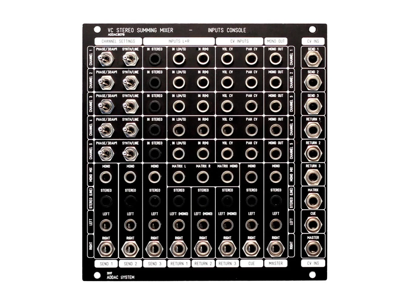 Massive in size and functionality, the ADDAC807 from ADDAC System is a stereo summing mixer bundle of two modules that provides one of the most flexible and comprehensive takes on Eurorack mixing. Robust with routing, the ADDAC807 breaks its entire system into two sibling modules: the main console that handles all the control and leveling, and the input console which feeds all the inputs and outputs, audio and CV. The system comprises five independent channels that can feed to a number of different processing and output paths, including three send and returns, a cue mix, a matrix mix, and a master output, most of which provide means to handle both Eurorack and line-level signals.