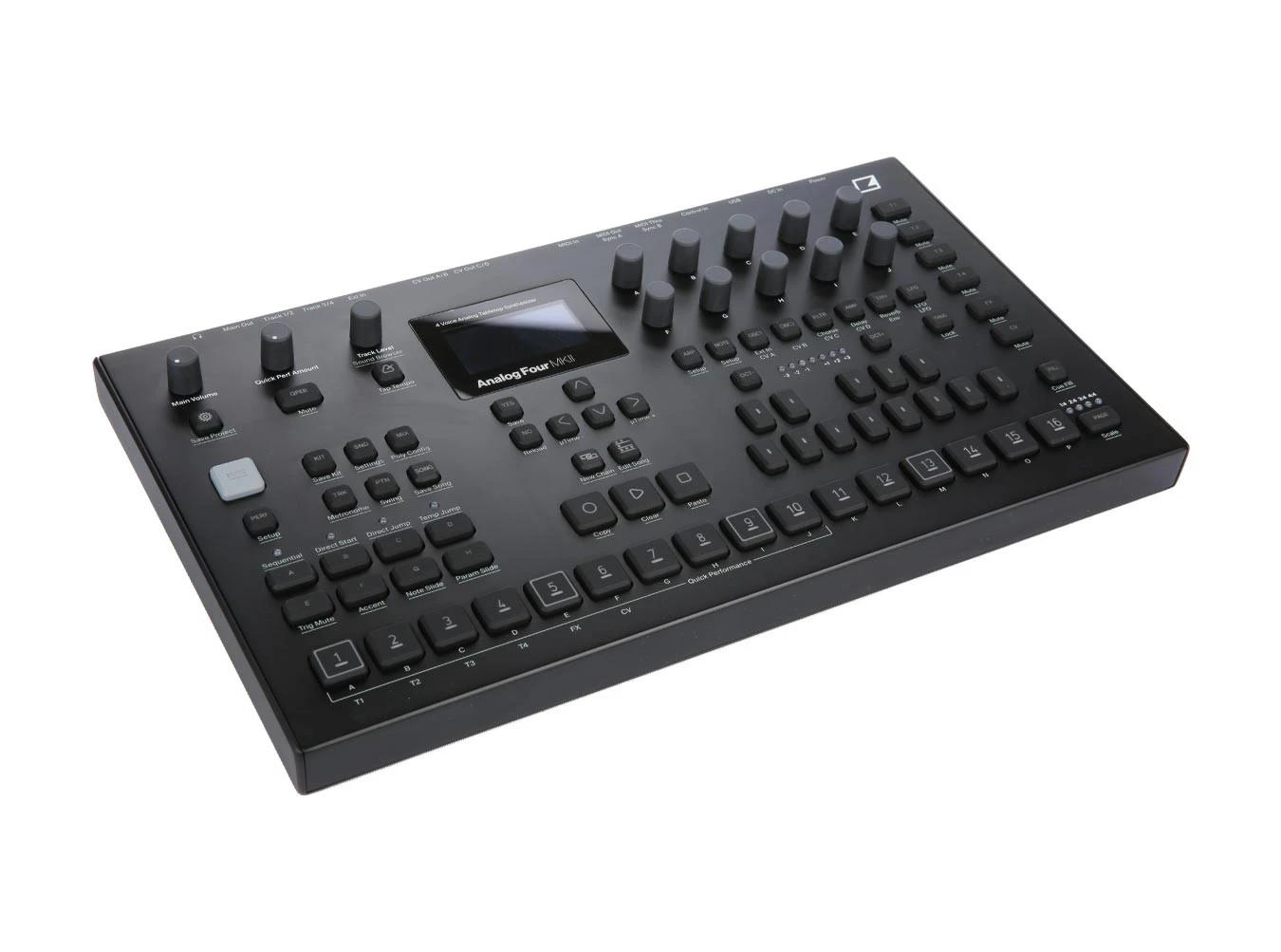 As its name conveys, the Elektron Analog Four mk2 is a polyphonic analog tabletop synthesizer with a total of four voices. It features an intuitive sequencer that lends some structure to its dense analog architecture. In addition to powerful analog tones, the unit features four CV/Gate outputs for controlling external devices, making it the ideal centerpiece for both tabletop and modular setups.