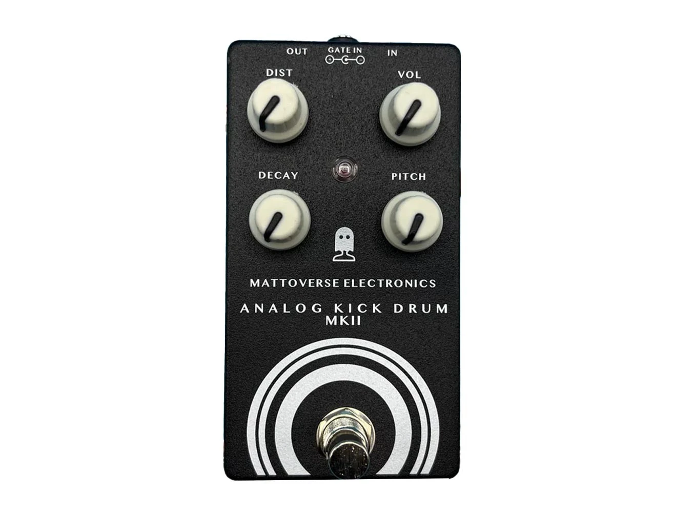 Surprise everyone at your next gig—especially your drummer—by throwing Mattoverse’s Analog Kick Drum MkII on your pedalboard, a compact percussion voice disguised as a pedal. Operating without an input or summing its sound with an external source, the kick drum circuit is triggered by tapping on the momentary footswitch. Simple but effective, Analog Kick Drum MkII is shaped with Pitch, Decay, and Distortion controls, plus an output Volume level. Though the thickest and fattest kicks will be found through a PA or other large speaker, it makes a fine addition to a pedalboard running into a guitar amp for the solo performer. Fill out your sound with the Mattoverse Analog Kick Drum MkII.