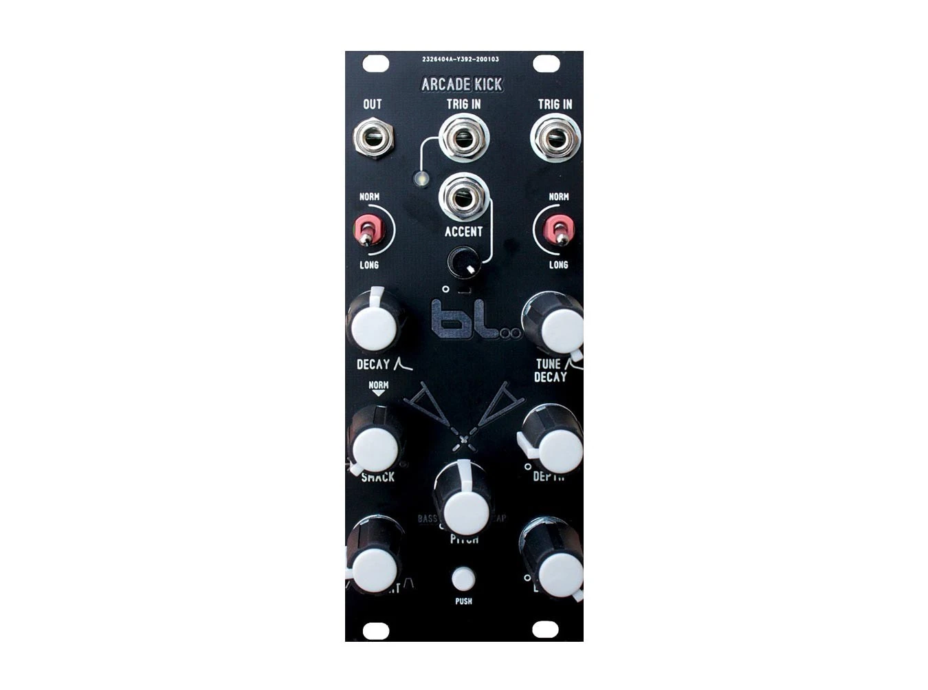 The Blue Lantern Arcade Kick is a kick drum module inspired by the TR-909 drum machine, perfect for big booming techno kicks. The internal oscillator is a triangle-core with an internal reset. It features envelopes for both VCA and pitch, each with switches to select between normal or long decay. The two trigger inputs can be used together, employing “OR” logic to combine the two inputs—and can accept signals well in audio rates.