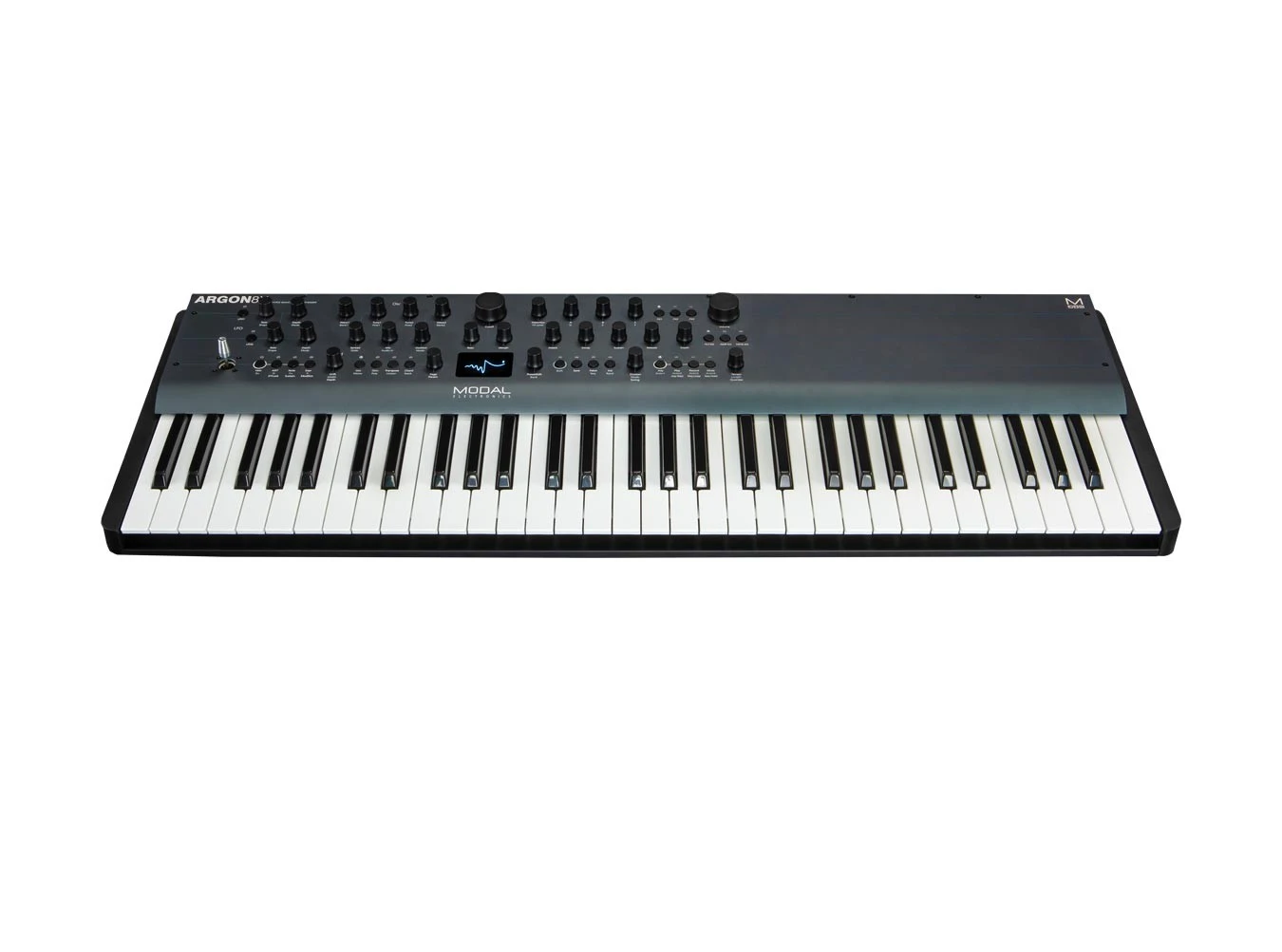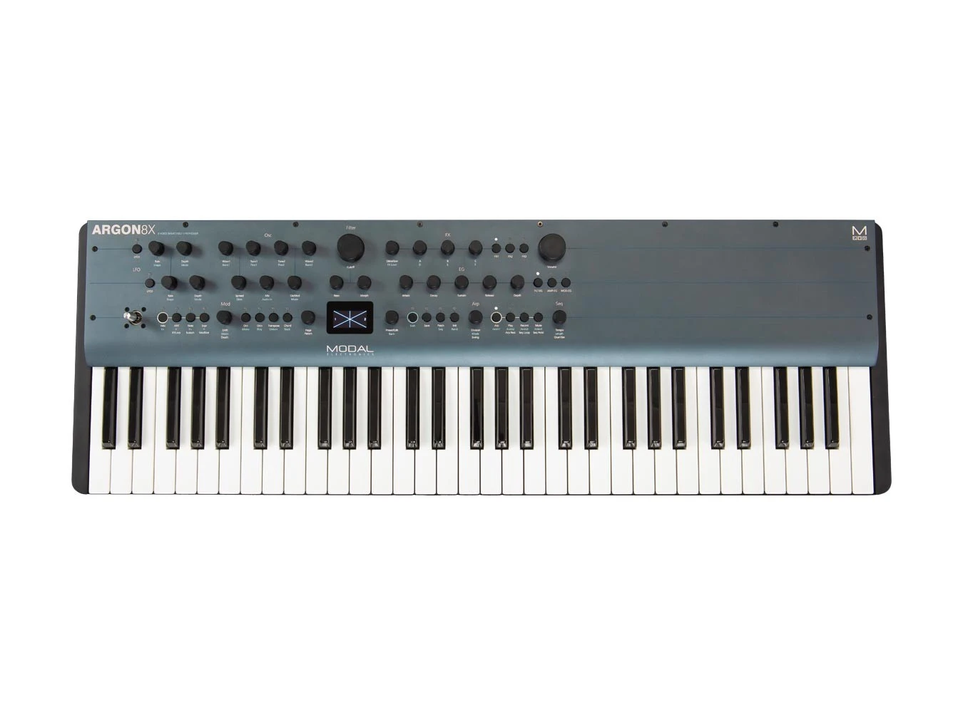The Modal Electronics Argon8x is a 61-key version of the Argon8 eight-voice wavetable synthesizer, adding a larger keybed while retaining the same powerful sound engine. This polyphonic, monotimbral digital synthesizer features eight voices, each with four wavetable oscillators. The four wavetable oscillators are grouped into pairs and features 120 waveshapes, split into 24 banks of five morphable waveform sets. These include the waveforms found on classic analog synthesizers, a selection of modern, EDM-style waveforms, and many from the Modal 002. The two groups of waveforms can be spread apart and mixed to create complex combinations of waveforms.