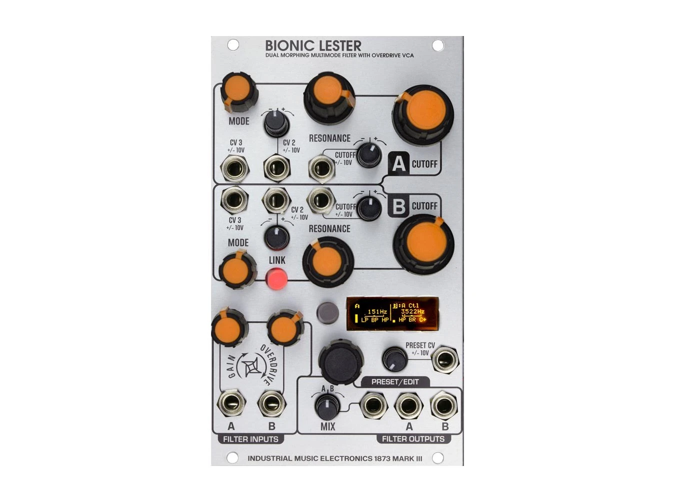 From Industrial Music Electronics, the Bionic Lester MK III is a dual 2-pole state variable digital filter inspired by the “virtual analog” filters of the late ’90s. Each filter has controls for cutoff, resonance, and mode. An OLED screen displays cutoff frequency, resonance amount, and filter type. Using either the mode control or CV, it can smoothly morph filter types from lowpass to bandpass, highpass, notch, and allpass/comb filter. The allpass/comb mode features three types of tuned delay lines; allpass, positive feedback comb, and negative feedback comb. The audio inputs feature a digital VCA before the filter with gain and distortion control. From the lowest setting to the middle settings, the control simply controls the gain. Past the middle point, it begins to soft clip and eventually hard clips as it reaches the maximum values. These harmonic distortions can then be further shaped by the filters. Each filter has three CV inputs, with one hardwired to the filter’s cutoff frequency. The other two CV inputs can be assigned to any parameter: resonance, mode, gain, or cutoff.