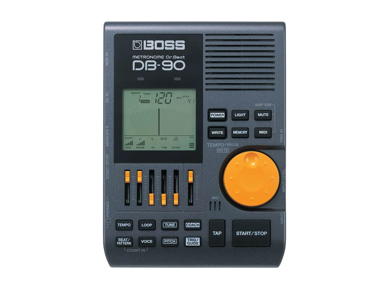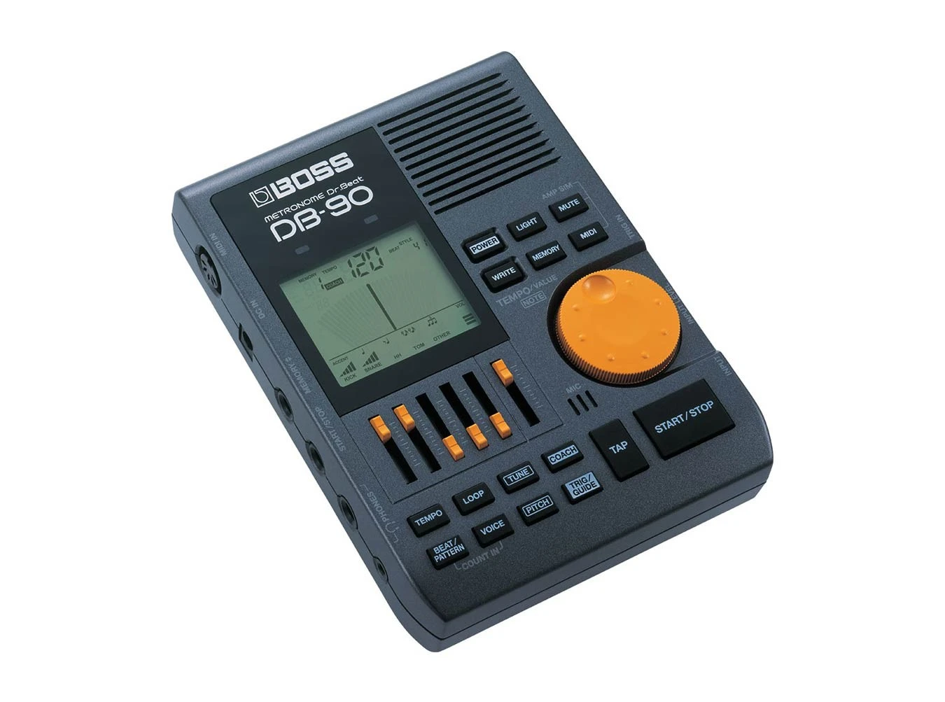 The Boss DB-90 is quite possibly the most advanced metronome on the market today. Not just a vanilla metronome, the DB-90 comes loaded with dozens of drum patterns and features realistic PCM drum sounds. An audio input allows the DB-90 to tune instruments and monitor them with a built in headphone output. There are four training modes to improve timing and accuracy. It features a MIDI and trigger inputs that can be used to practice with an electronic drum pad. Alternatively, the on-board mic can be used to practice with acoustic drums. Five sliders set the volume of the drum sounds or the note division on the metronome, allowing for customization of metronome patterns for any scenario. Up to 50 presets can be stored and easily recalled on the fly. Much more than a metronome, the DB-90 offers features and functionality found nowhere else.