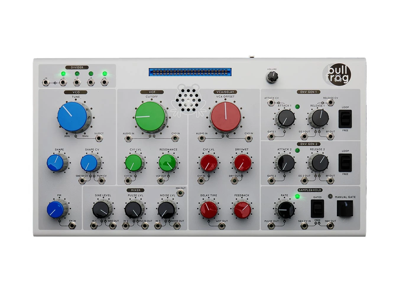 With a completely analog design, Bullfrog begins with a high-quality oscillator that features variable waveshapes and superb tracking across eight octaves. From there, a dependable VCF resonant lowpass filter and a combination VCA + Delay effect complete the signal path for delicious and inspiring tones. Bullfrog also features two looping envelope generators plus a sample and hold circuit for controlling and modifying sounds. Surprisingly rare for a synthesizer, Bullfrog even has a built-in speaker for easily listening to your patch, though of course, you can use the external audio and headphone outputs if you prefer.