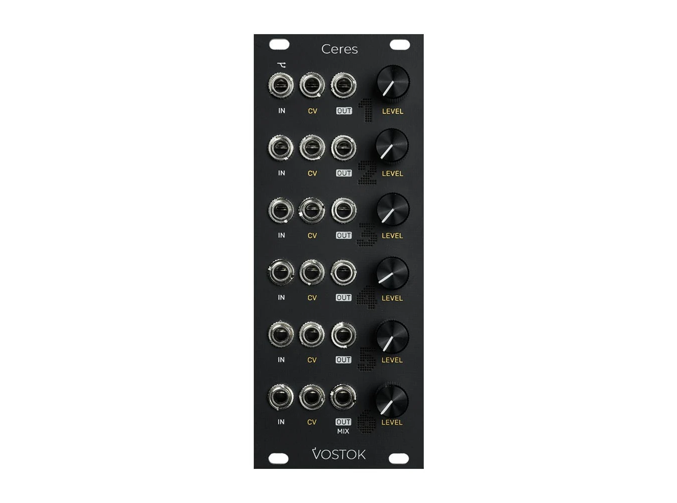 Vostok brings us a fantastic utility and cornerstone for all modular systems with the Ceres, a six-channel linear VCA and mixer module. Designed to be ultra-quiet with minimal bleed, each channel features a level control, CV input and independent outputs with a Mix output on channel 6. To remove an output from the Mix channel, simply patch the channel’s output to the desired location. Inputs are also cascaded and to break the flow, just patch the input where you want it to stop. Versatile and compact, Ceres is perfect for every modular system.