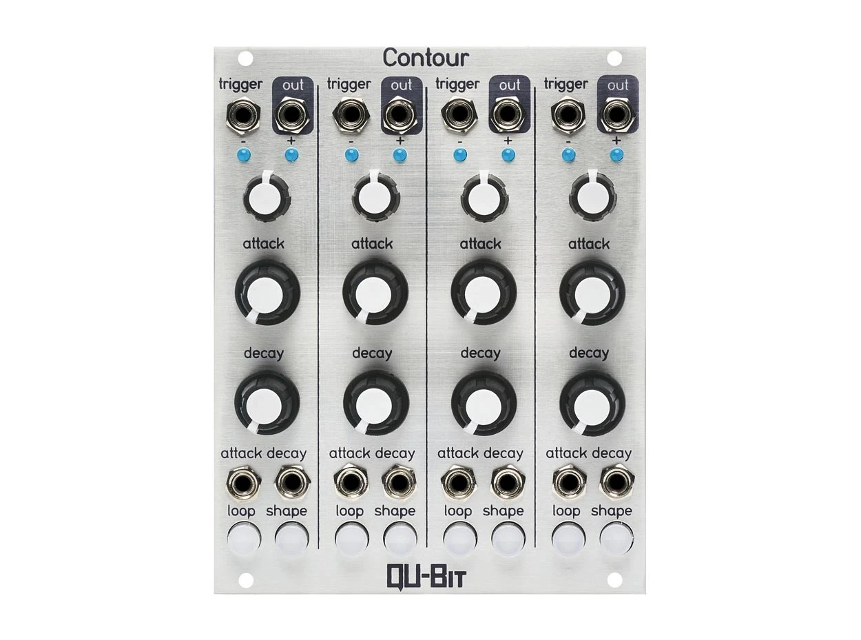 The Qu-Bit Electronix Contour is a quad AD envelope with CV control over Attack and Decay parameters, and looping functionality. Each channel features a trigger input that can also accept gates for an increased sustain amount. A bias button controls the overall output level and polarities of each signal, while the shape button shifts the slope of each envelope from linear to exponential. Best of all, the triggers are normalized, enabling them to be patched together for intricate multi-stage envelopes.