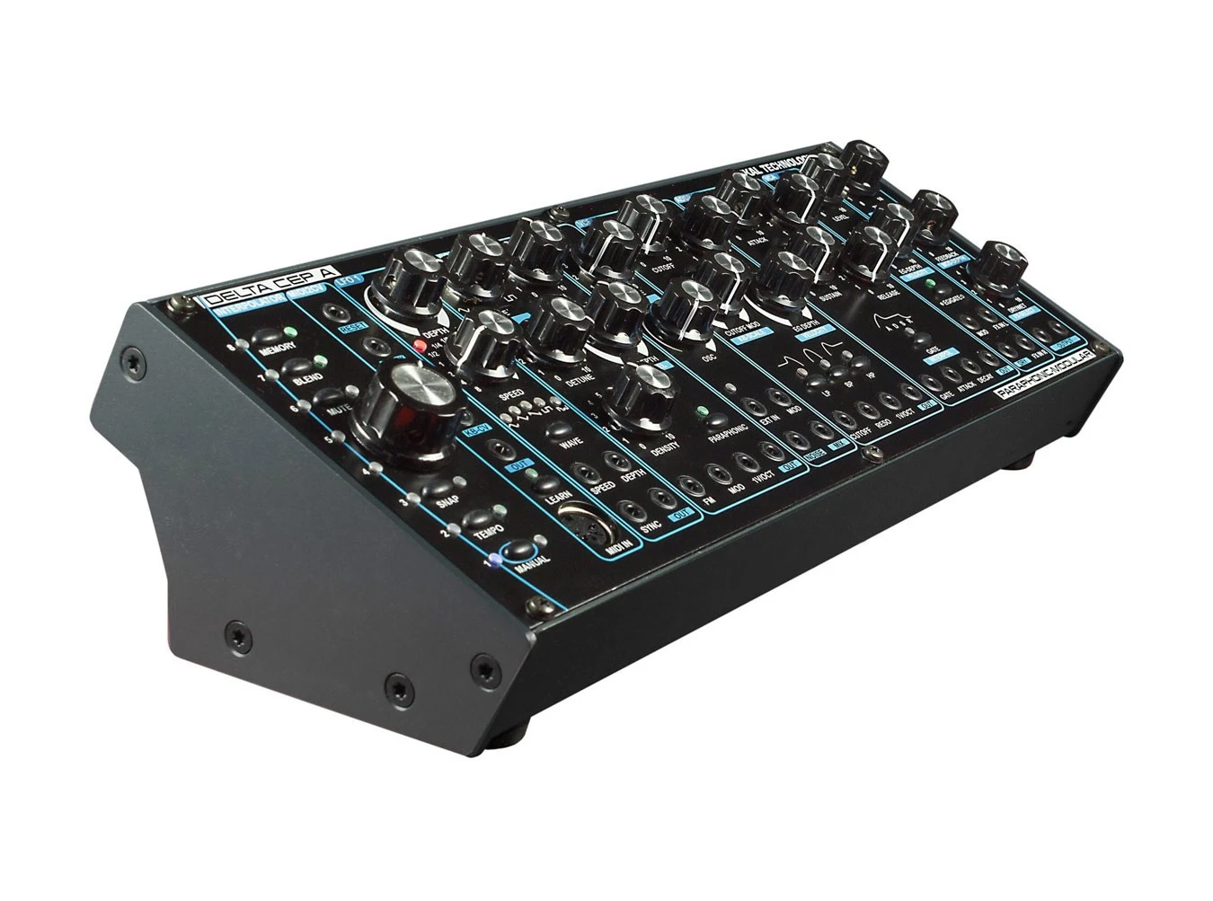 Delta Cep A, from Radikal Technologies, is a beefy paraphonic synthesizer that serves as a perfect entryway into the world of modular synthesis or as a welcome addition to any extant system. It is comprisied of several distinct sections: an eight-voice swarm oscillator, noise generator, analog and digital multimode filters, VCA, and comprehensive effects section. There’s also a modulation section consisting of an LFO, ADSR envelope, and MIDI-to-CV interface. Best of all, Delta Cep A’s integrated interpolator ensures that users can save their ventures and combine presets when needed.