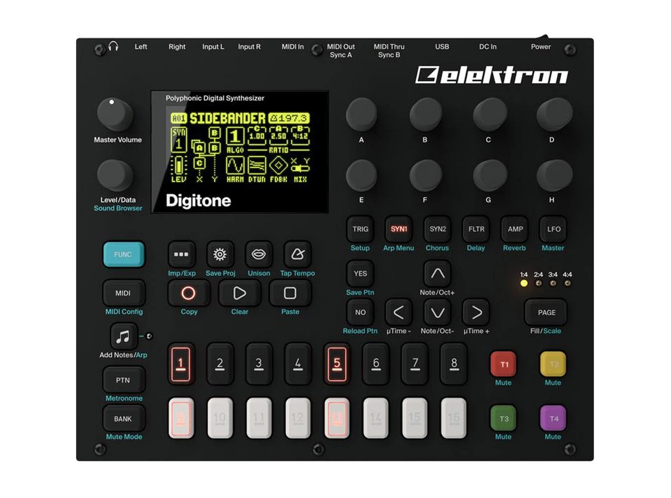 Through reducing the intimidation factor of FM synthesis, Elektron borrowed filtering concepts from their past instruments for a unique blend of FM and subtractive synth stylings. Once sounds are generated in a traditional FM fashion, you have further sculptability through both a multimode filter with resonance and the classic Elektron Base-Width filter. There’s also an ADSR-style envelope available for both the filter and amplitude, as well as two LFOs which may be assigned to modulate various sound parameters.