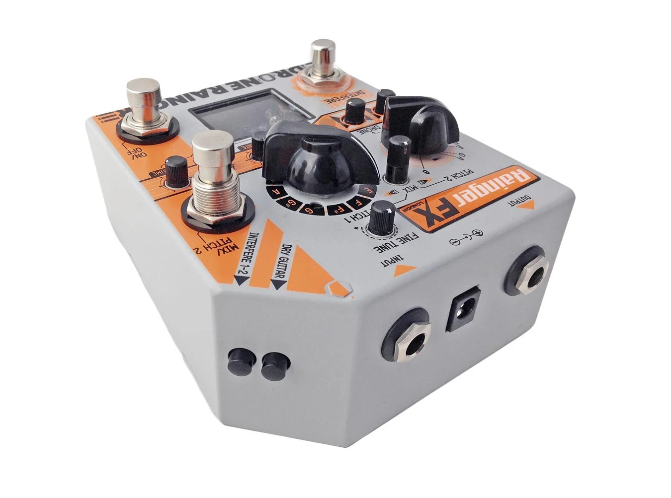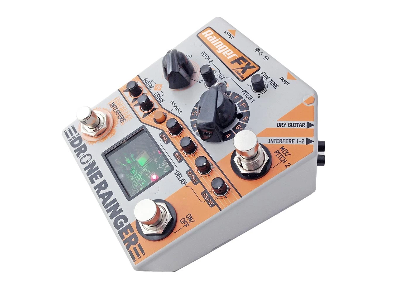 Both of Drone Rainger’s generators have two remotely switchable effects: a tone-down pitch drop for delightful pitch sagging, and a delay chip-sourced white noise burst. Additionally, the pedal can be configured to emit two different notes, with the ability to fine tune either while playing.