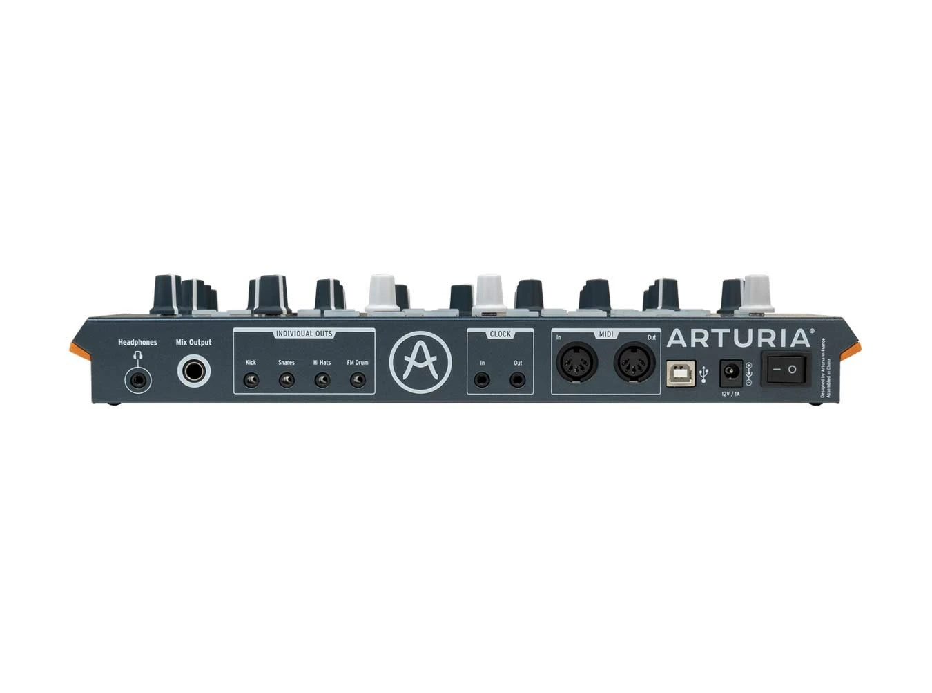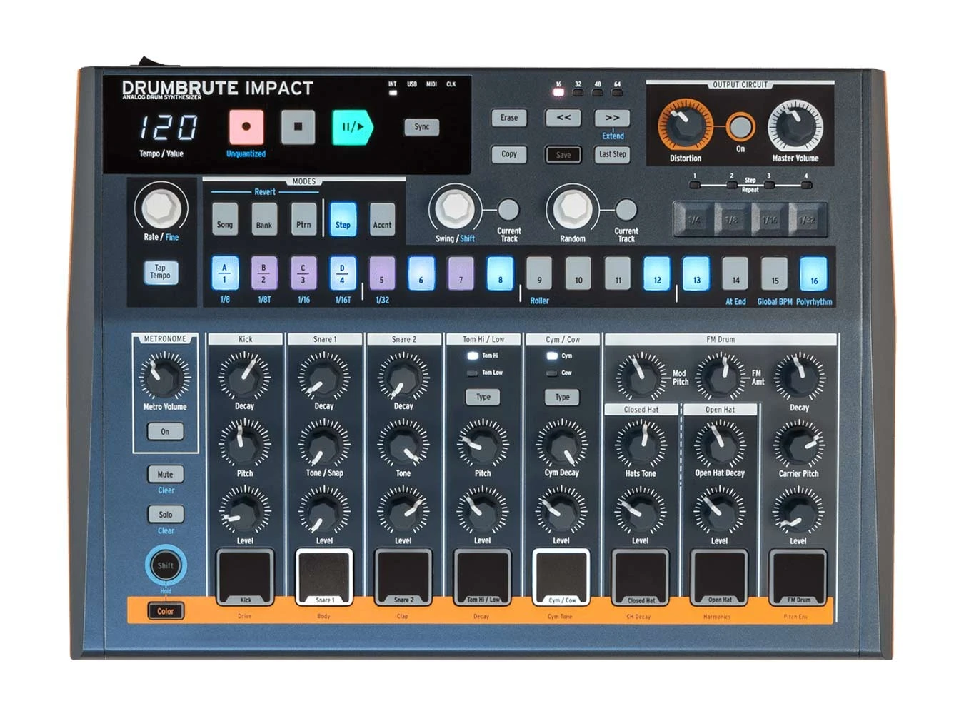 - 10 discrete analog drum sounds: Kick, Snare 1, Snare 2, Tom Hi, Tom Low, Cymbal, Cowbell, Closed Hat, Open Hat, FM Drum
