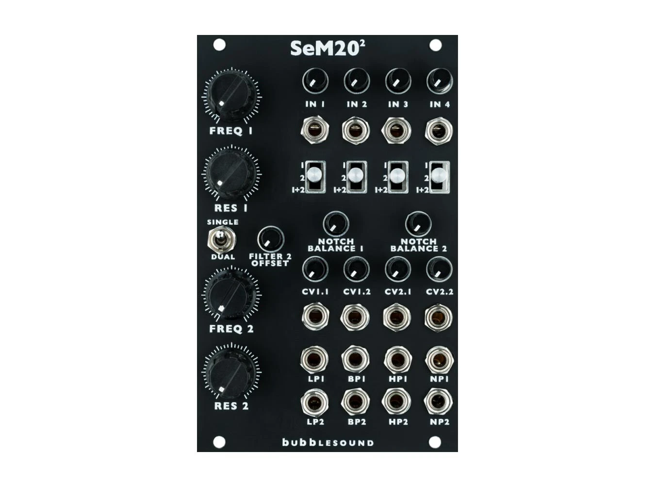 The Bubblesound Instruments Dual SeM20 is a two-channel VCF based around a mashup of the Oberheim SEM filter with the resonance section from the MS-20 for added character, as well as features found on the OSCar synthesizer. The signal path starts with a four-channel mixer with the option to route the inputs to filter 1, filter 2, or both. With the input knob at the center position, the input is at unity gain. Past that, the signal will begin to overdrive and distort. Each of the filters have two CV inputs with attenuators. There is a switch for either single or dual mode. In dual mode the top frequency knob and CV 1.1/1.2 control both filters. A filter 2 offset knob is available in dual mode and acts like the spread feature in the OSCar which spreads out the cutoff frequencies of the two filters. The notch balance knobs sweep between highpass and lowpass filtering. The many inputs and outputs make patching complex feedback loops easy and can result in unexpected behaviors. The SeM20 can really scream when pushed to its limits or can offer smooth Oberheim-style filtering.