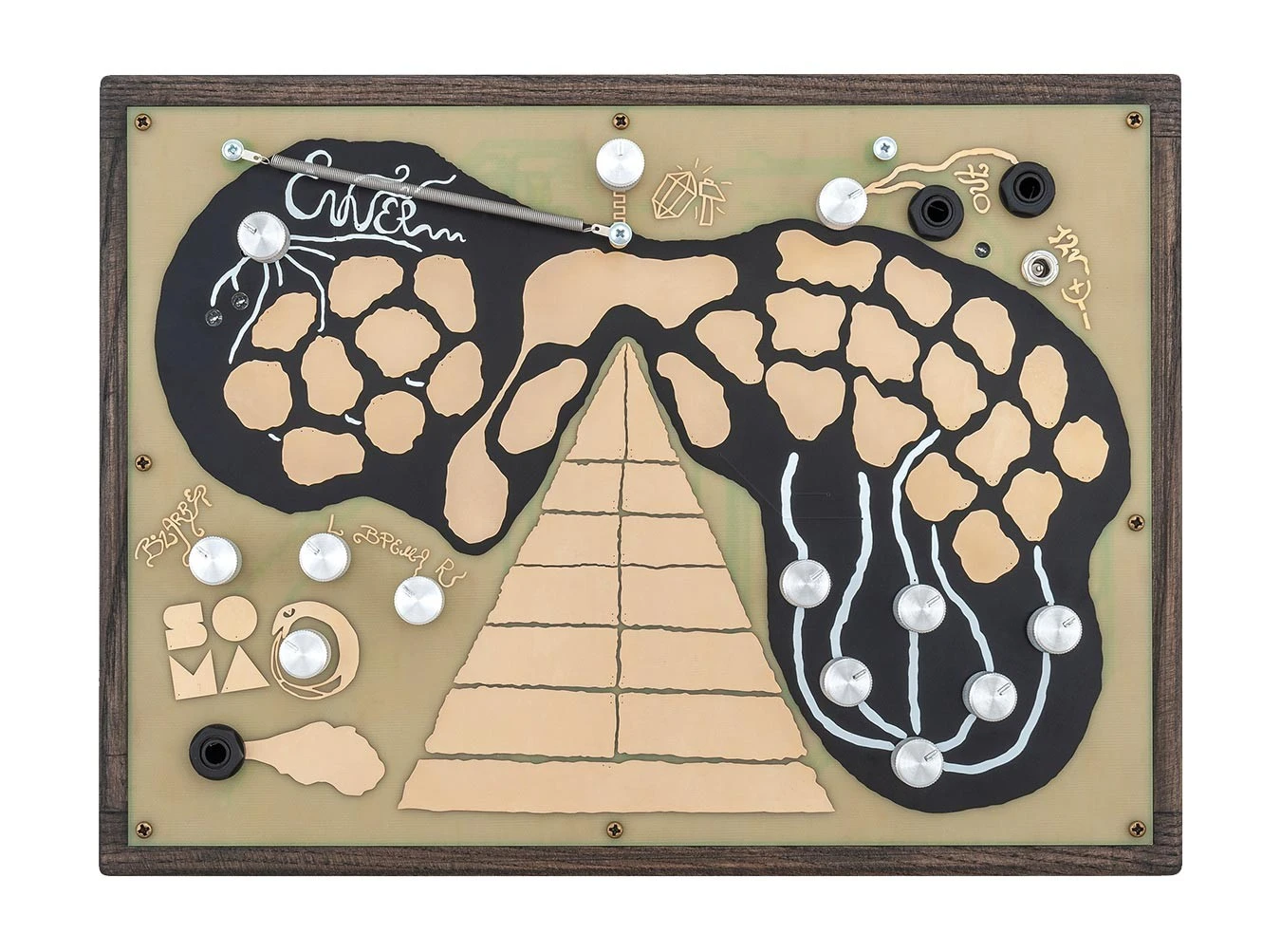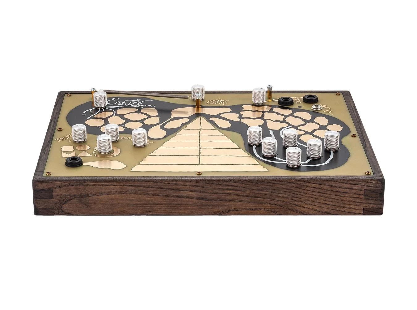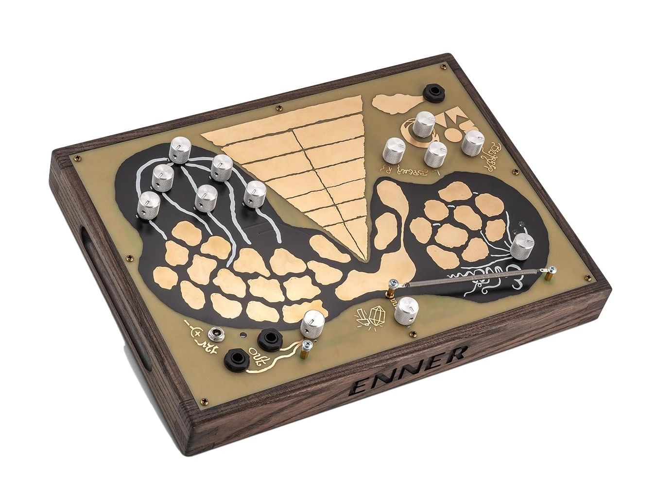 Enner from SOMA is an analog touch-plate stereo synth and electroacoustic instrument that is expressive, strange, and fun to play. Divided into a left, right, and center configuration, the Enner requires your flesh to form connections from the synth on the left, or the right, or the built-in Piezo mix to one of the audio outputs in the centerpiece triangular plate. The triangle itself is divided into two sections for the left and right to create a wide, spatial stereo field. At the bottom of the triangle is a pink noise output and a built-in delay with independent left and right delay times, which aid your creation of truly dosed soundscapes.
