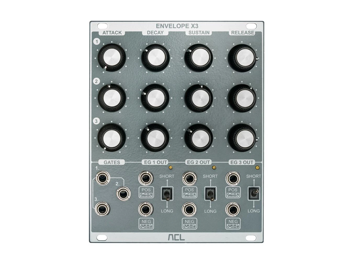 Envelope X3, from ACL, is a triple ADSR envelope generator modeled on those of the Roland 100M modular synthesizer. Not content to be a mere emulation, the module boasts even shorter envelope time parameters. Its rapid response time makes it ideal for drums, bass, and any other sound that requires a snappy envelope. However, it can also handle longer envelopes with grace, making it ideal for drones, pads, and more.