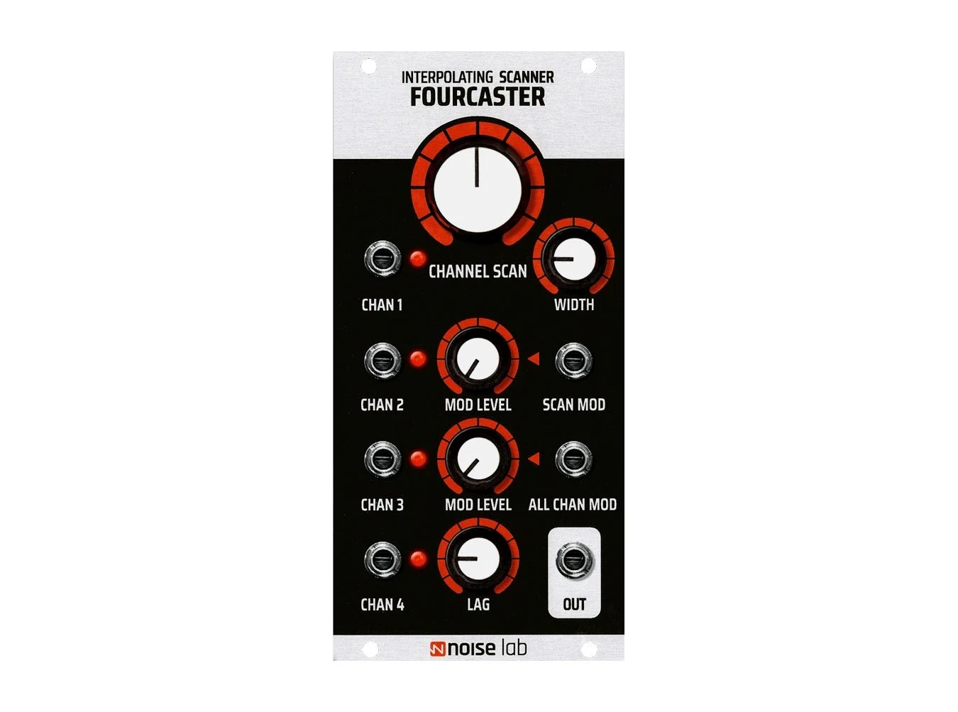 The Noise Lab Fourcaster is a 4:1 voltage-controlled crossfader that includes a number of cleverly-designed macro controls to facilitate a variety of morphing, evolving effects. Up to four channels can be crossfaded between using the Channel Scan knob, a function which can also be voltage controlled via the Scan Mod CV input. The All Channel Mod control affects all channels’ levels simultaneously, while the Lag control applies a slew to the scanning function, smoothing the effect. The Width control simply controls how wide the scanning window is, allowing for more or less isolation between the channels while scanning through them.