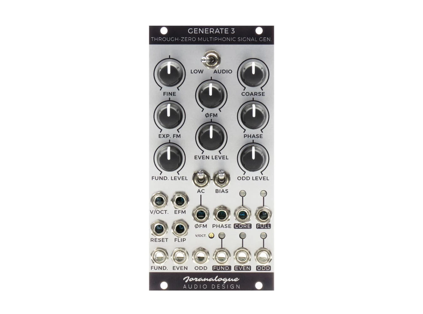 The Joranalogue Generate 3 describes itself as a through-zero multiphonic signal generator, great for harmonically complex tones. It provides a wide range of through-zero modulation options including frequency, phase, and amplitude modulation. The oscillator is a triangle core oscillator that can be used in the audio or sub-audio range, and tracks 1 v/oct over its entire audio range.