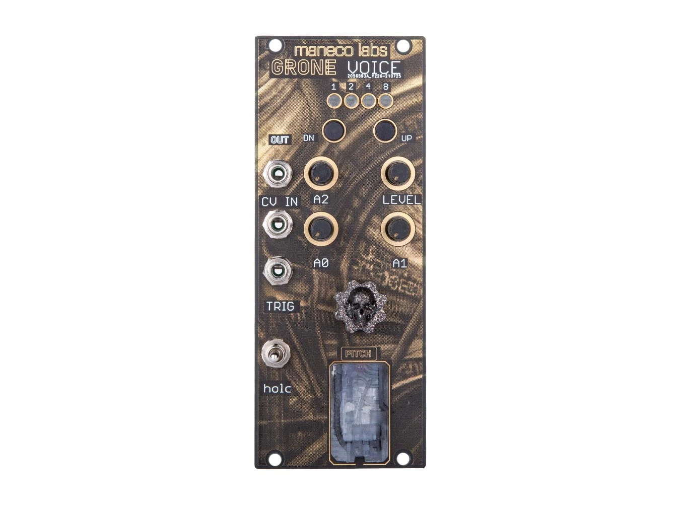 If you’re looking for the sound of posessed dial-up modems or cursed machinery, look no further than the Grone Voice from Maneco Labs. This module is loosely based upon the idea of bytebeats, which alogrithmically synthesize audio through the use of code formulas and function. There are 16 different functions available through the button interface at the top, and three variables are broken out to controls A0, A1, and A2 to provide variance in the resulting sound. Grone Voice may be triggered manually with the touch pad, through external trigger signals, or may drone indefintiely by flipping the Hold switch up. With a global pitch control and external CV input, one may traverse the entire audible range for glitchy, sputtery digital audio at any frequency. Add some quirky digital fun to your Eurorack system with Grone Voice by Maneco Labs.