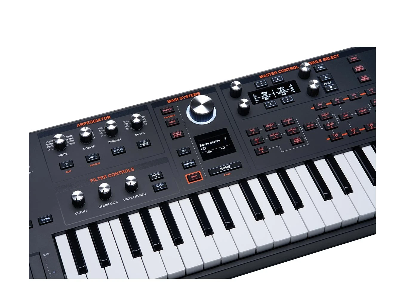 To tie everything together, the performance capabilities provided are quite stupendous. The onboard arpeggiator gives you control over time division, gate size, swing, and even some rarer options like ratcheting and chance. Along with the provided pitchbend and modulation touchstrips, the Hydrasynth Explorer accepts MPE messages and even provides polyphonic aftertouch, something already rare in full-sized key synths, let alone a compact synth. These features provide variety and individuality to each voice you play, while the eight macro knobs make it easy for large sweeps and changes over multiple parameters. And to top it off, MIDI In/Out and multiple CV outs allow for the perfect integration in any studio or live setup.