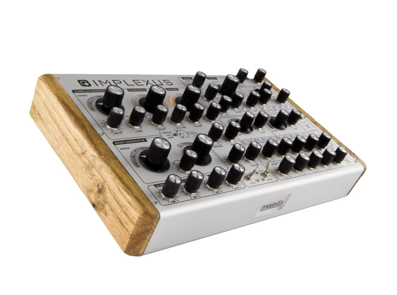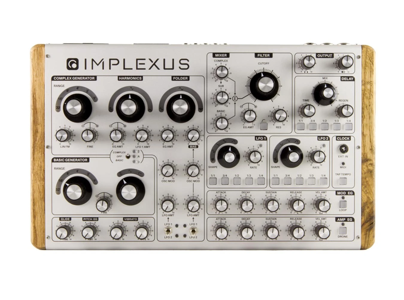Implexus from Majella is a fantastic combination of east and west coast synthesis in the form of a desktop synthesizer, loaded with both analog and digital goodness. Starting with a west-coast approach, the Implexus features two analog oscillators set up in a traditional complex routing of carrier and modulator—or in this case, complex generator and basic generator, respectively. Both oscillators have coarse octave shifting as well as fine tune controls along with a shared internal oscillator tuner that can be used on either at any time for extra-fine tuning. Though the basic oscillator gives you only three traditional waveshapes to choose from, the complex generator features variable harmonic shaping, wavefolding with biasing, and two additional audio-rate modulation amounts.