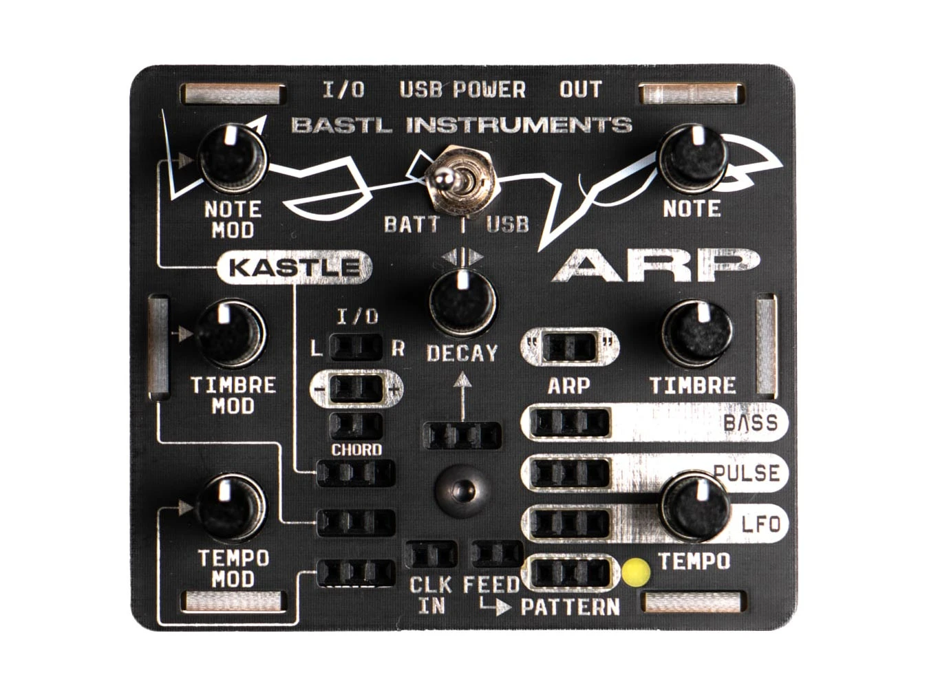 A melodic addition to the compact BASTL instrument family, the Kastle ARP is a teeny patchable synthesizer that generates inspiring and spontaneous arpeggiated tones. Rather than using a traditional arpeggiator, Kastle ARP features a pitch-quantized oscillator that can be modulated by the onboard LFO. Kastle ARP determines pitches based on connections to the Chord input section—by default, Kastle ARP will offer the timeless I-IV-V progression in the key of C, but these chords and keys may be changed in Boot Mode. Interesting note interactions can occur by exploring the Decay envelope’s behaviors: turning to left means note changes will retrigger the envelope, but turning to the right will suppress new notes from being heard until the envelope ends. Additionally, you can morph between simple sine waves to chiptune-esque tones with the Timbre control and Mod inputs. Whether this is your first Kastle or you’re rounding out the collection, Kastle ARP can bring surprising melodies to any assortment of instruments.