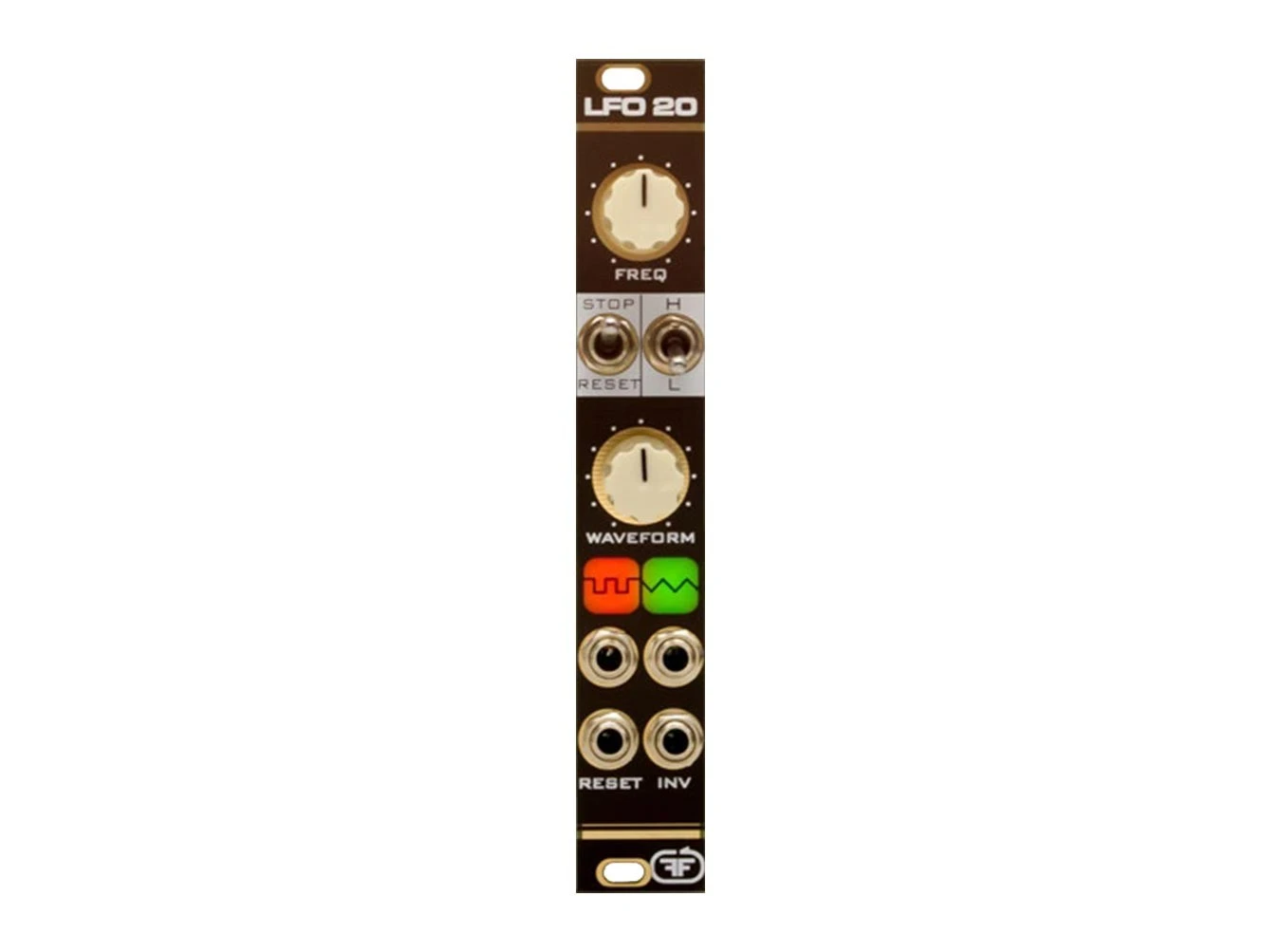 LFO 20 from Feedback Modules is a compact and complex LFO with Pulse and Triangle outputs in just 4hp. The Waveform knob lets you adjust the shape from Saw–Ramp on the triangle output, and the Pulse Width on the square output. In addition to the main outputs, there is an INV output that sends out an inverted copy of the triangle waveform. A switchable Reset/Stop input lets you create more complicated, interwoven signals throughout your patch. Capable of going as slow as 3.5m and as fast as 40ms, the LFO 20 from Feedback is a great workhorse of an LFO that is perfect for just about any rack.