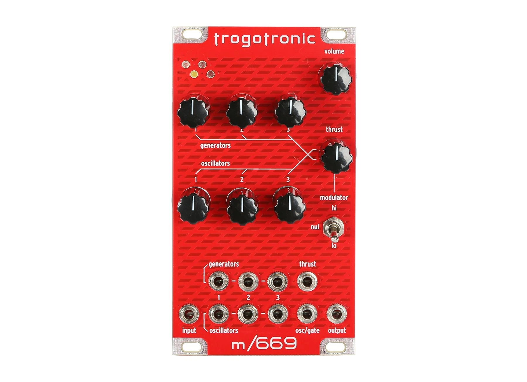 The Trogotronic m/669 module is based around a three-analog audio artifact generator array. Interaction between these generators results in complex analog waveforms. When used to process external audio signals, the results can be wonderfully horrific.