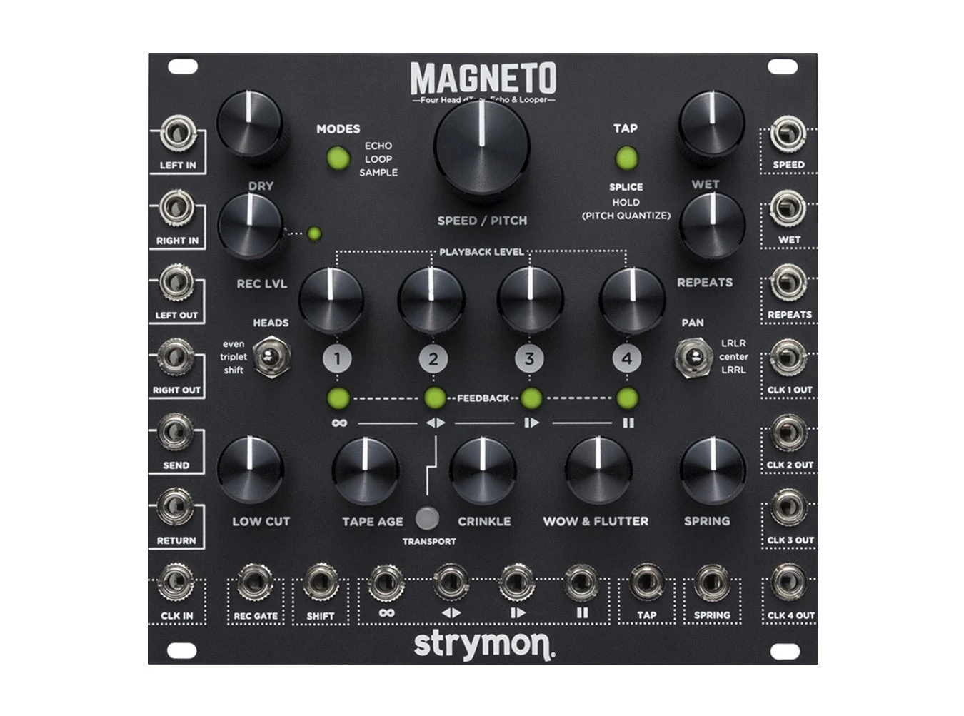 Magneto is a multifarious delay module of epic proportions. It derives inspiration from the world of magnetic tape delay effects, which comprises much of its surficial appeal. However, seeing as this is a Strymon product, there is certainly more than meets the eye. Magneto is capable of providing spring reverb, phrase sampling, echo, looping, clock division and multiplication, and even chaotic oscillations!