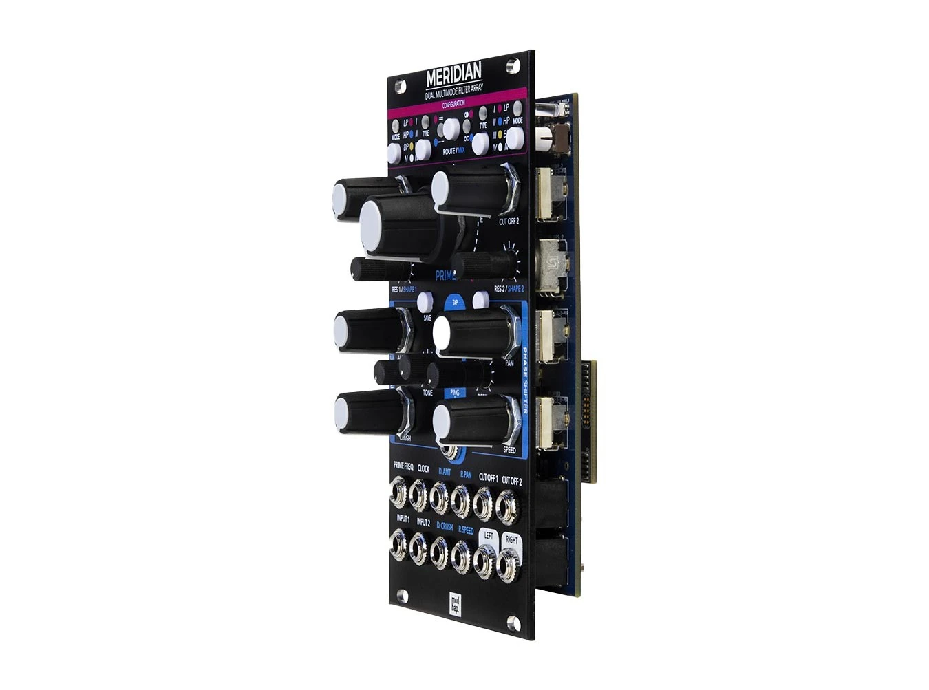 More than just two filters in one, Modbap Modular’s Meridian offers the ultimate converging of filtering topologies and techniques available to Eurorack modular systems. Positioned on either side of the module, the two filters are able to be assigned to a wide range of filter models and responses. With classic filter types like Ladder and OTA, you can conjure up sounds reminiscent of your favorite synthesizers, but Comb and Vocal Formant modes are available to get weird and wild too. Filter responses include the dependable lowpass and highpass, as well as bandpass and notch.
