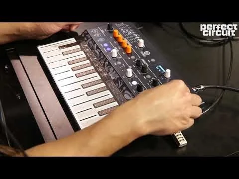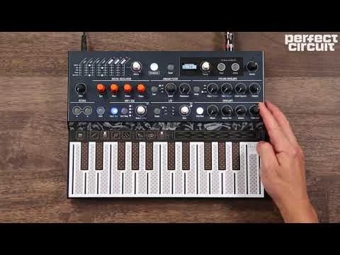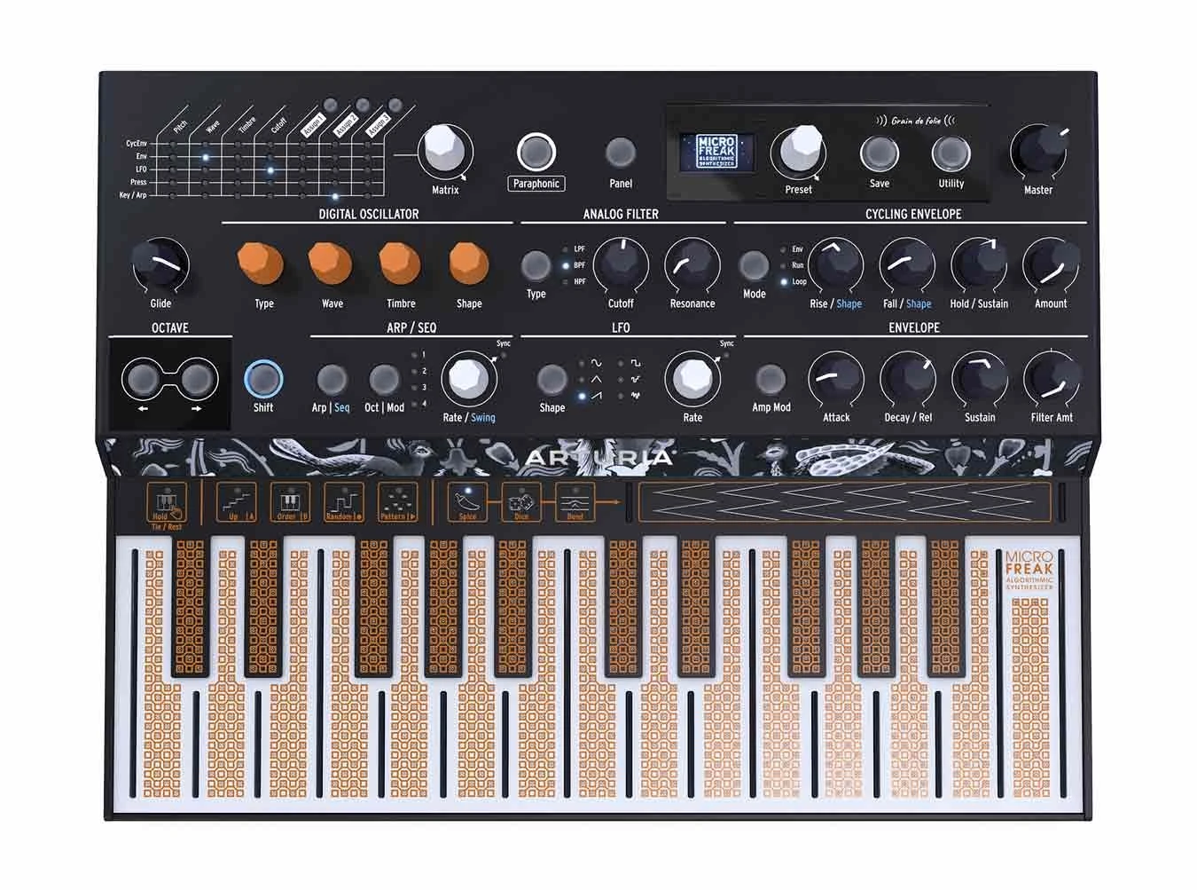Microfreak is a mini powerhorse paraphonic synthesizer from Arturia that seems to be heavily inspired by the Eurorack format. At its core Microfreak is a hybrid digital + analog synth controlled by a capacitive touch plate keyboard with polyphonic aftertouch. The oscillator section is digital and offers 11 different models, some of which were borrowed from the Mutable Instruments Plaits module. The filter is a fully analog 12dB/octave state variable design, greatly inspired by the Oberheim SEM. The modulation section includes an LFO, and two envelope generators, one of which is self-cycling. Unique to Microfreak is its modulation matrix, that even includes 3 user-selectable destinations. The synth is furthermore endowed with a capable chance-infused sequencer, random gate generator, and arpegiator. Interfacing Microfreak with external gear is made seamless through the CV/gate outputs, clock, and MIDI I/O found on the rear side of the unit.