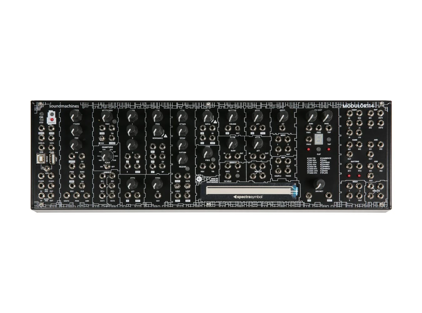 The Soundmachines Modulor114 is a self-contained modular synthesizer housed in an 84HP Eurorack panel mounted inside a custom case that can be powered in one of three ways: via USB, power adaptor, or Eurorack power cable. The synthesizer is compatible with all Eurorack format modules, but is a beast in its own right. A built-in USB/MIDI interface ensures optimal control with an external keyboard or sequencer. Other tactile controls include a ribbon controller and straightforward front panel interface with a convenient layout.