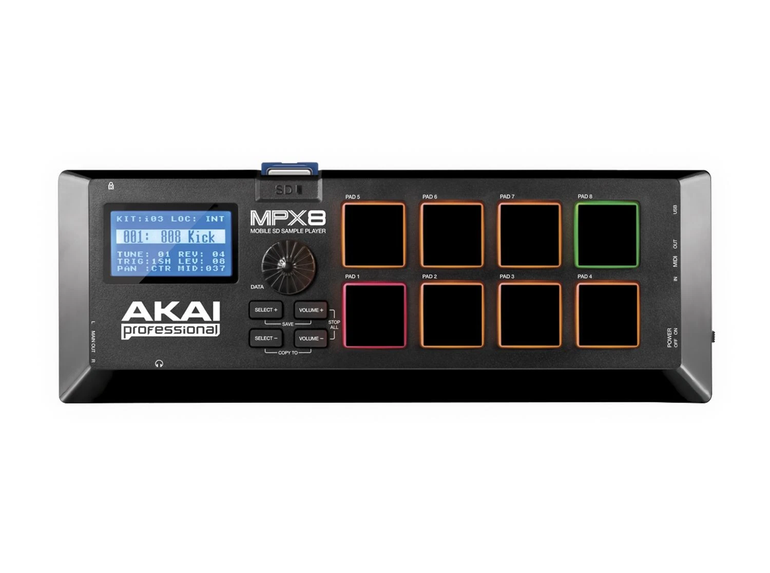 Akai MPX8 Sample Player lets users load samples with a standard SD or SDHC card, then assign each one to any of its 8 velocity/pressure-sensitive pads. Boasting powerful technology housed inside a compact but robust enclosure, the MPX8 is ideal for both studio and stage applications.