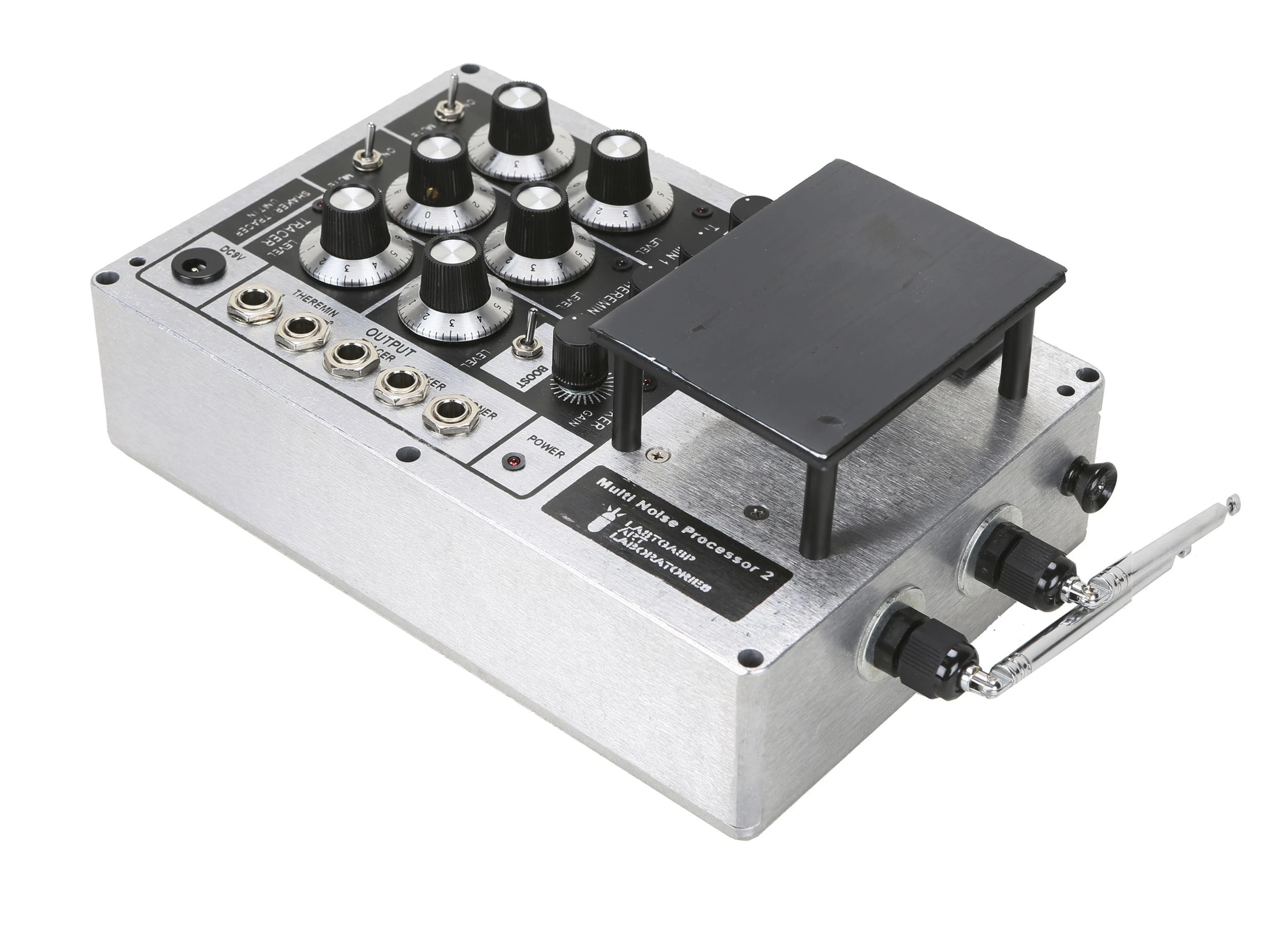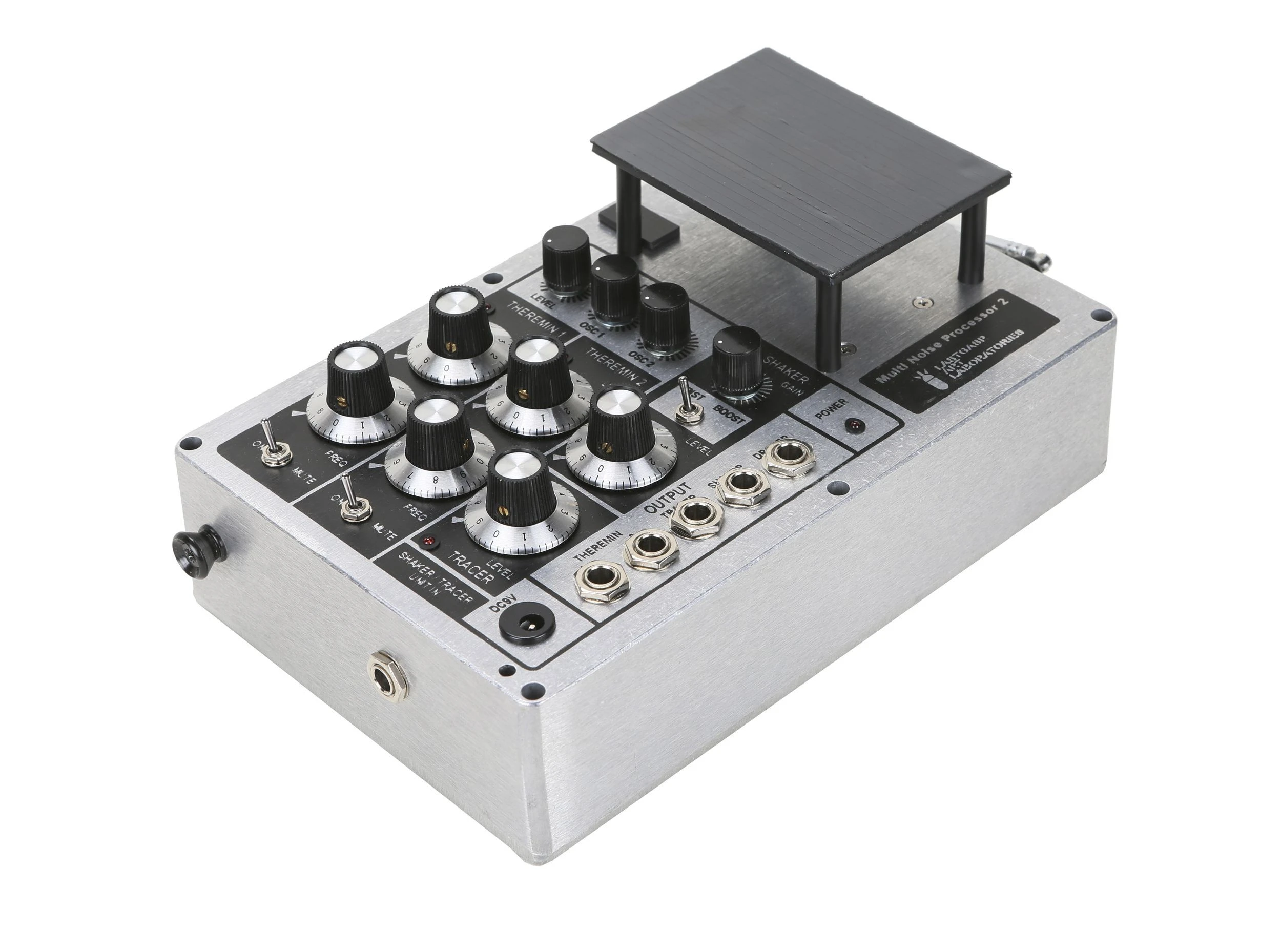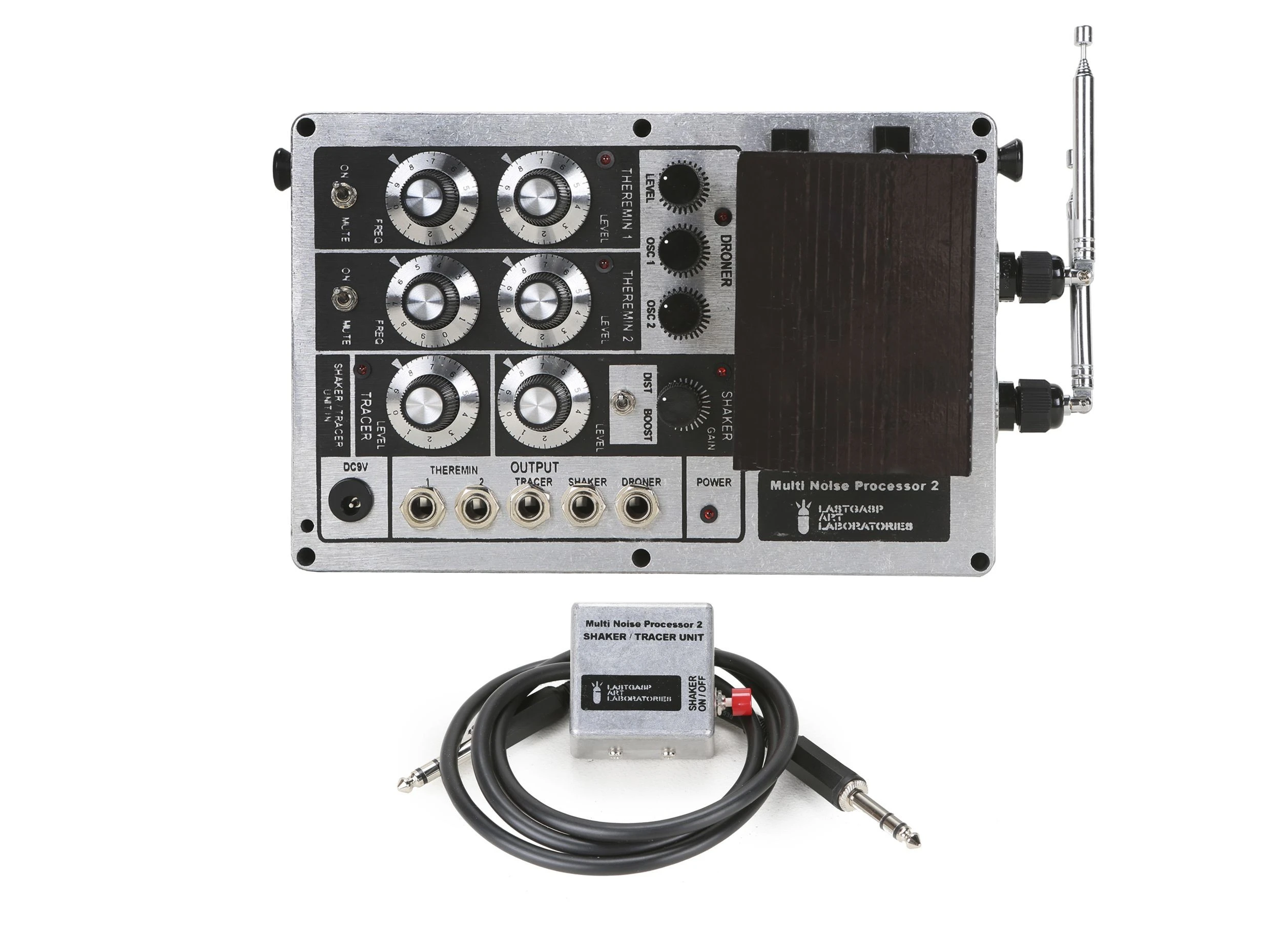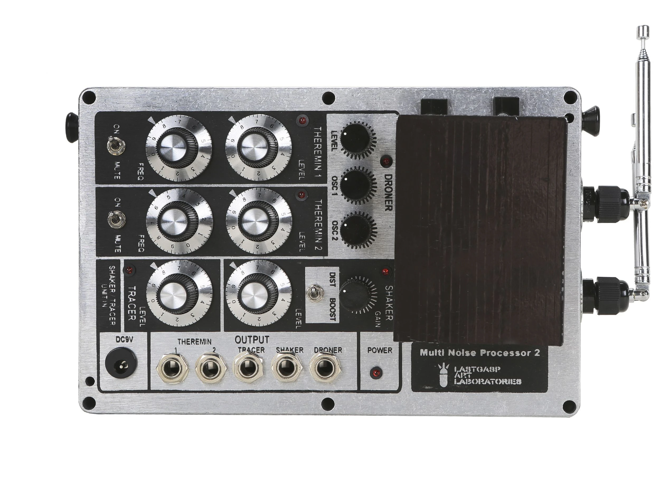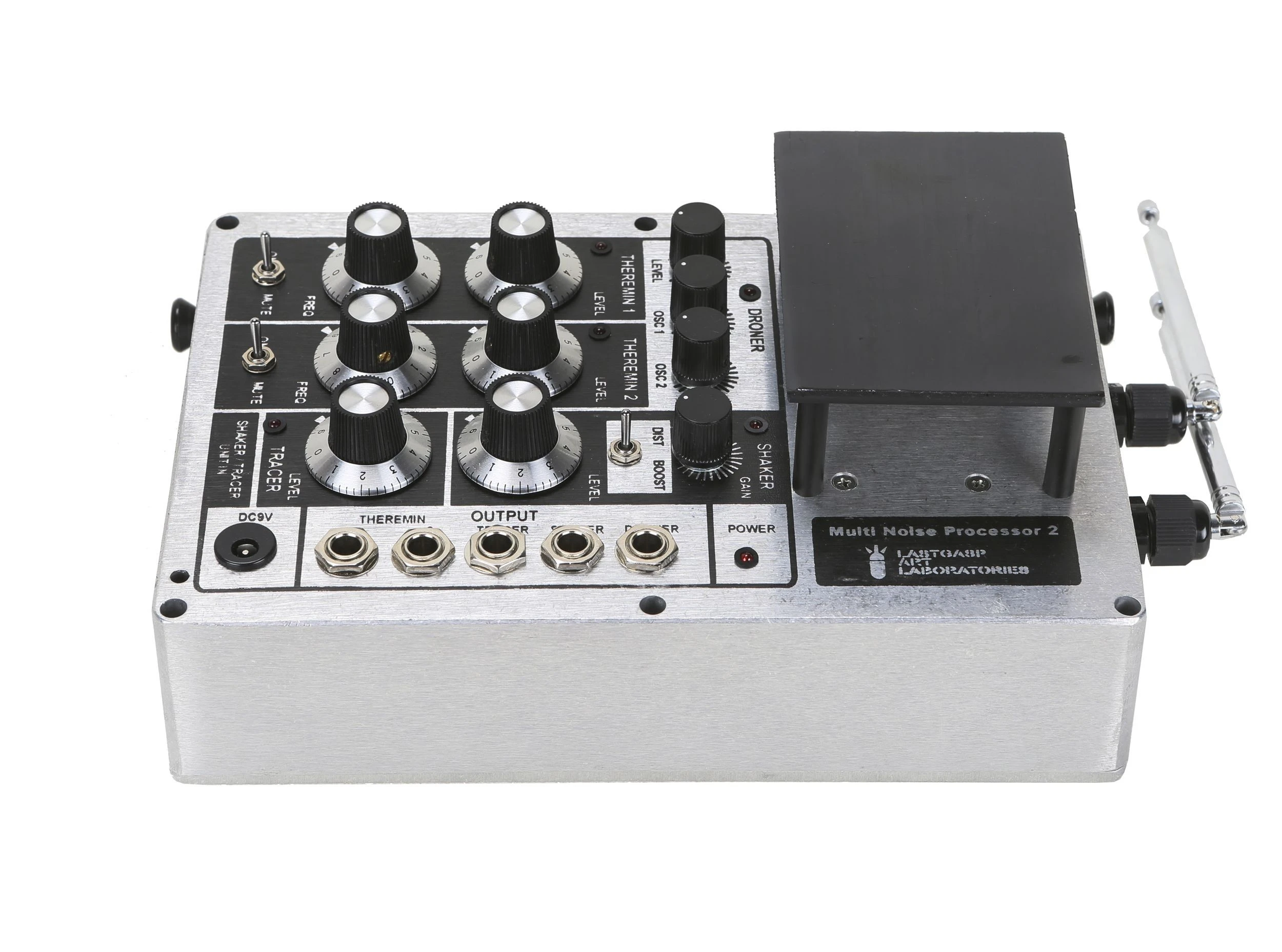 The LastGasp Audio Multi-Noise Processor 2 is a noise generator consisting of four distinct sound generators. The pedal boasts two theremins, a low-end oscillator called Droner, a shaking noise generator aptly dubbed Shaker, and a magnetic tape recorder labeled Tracer.
