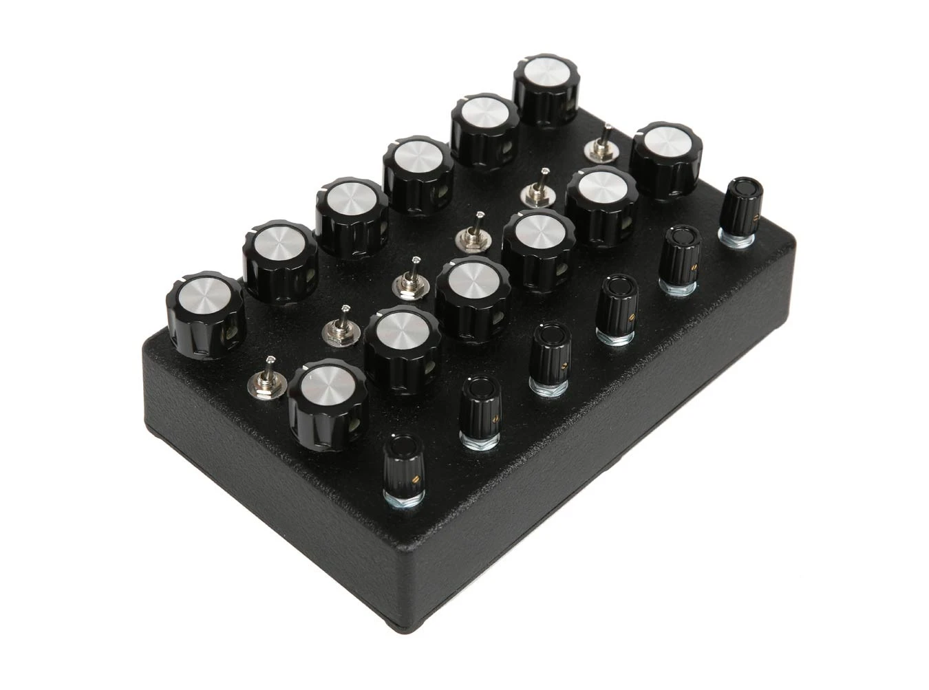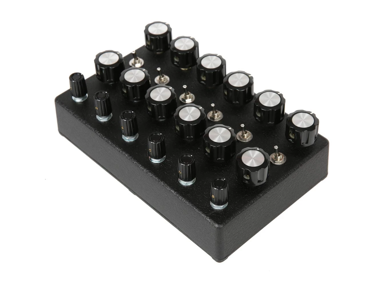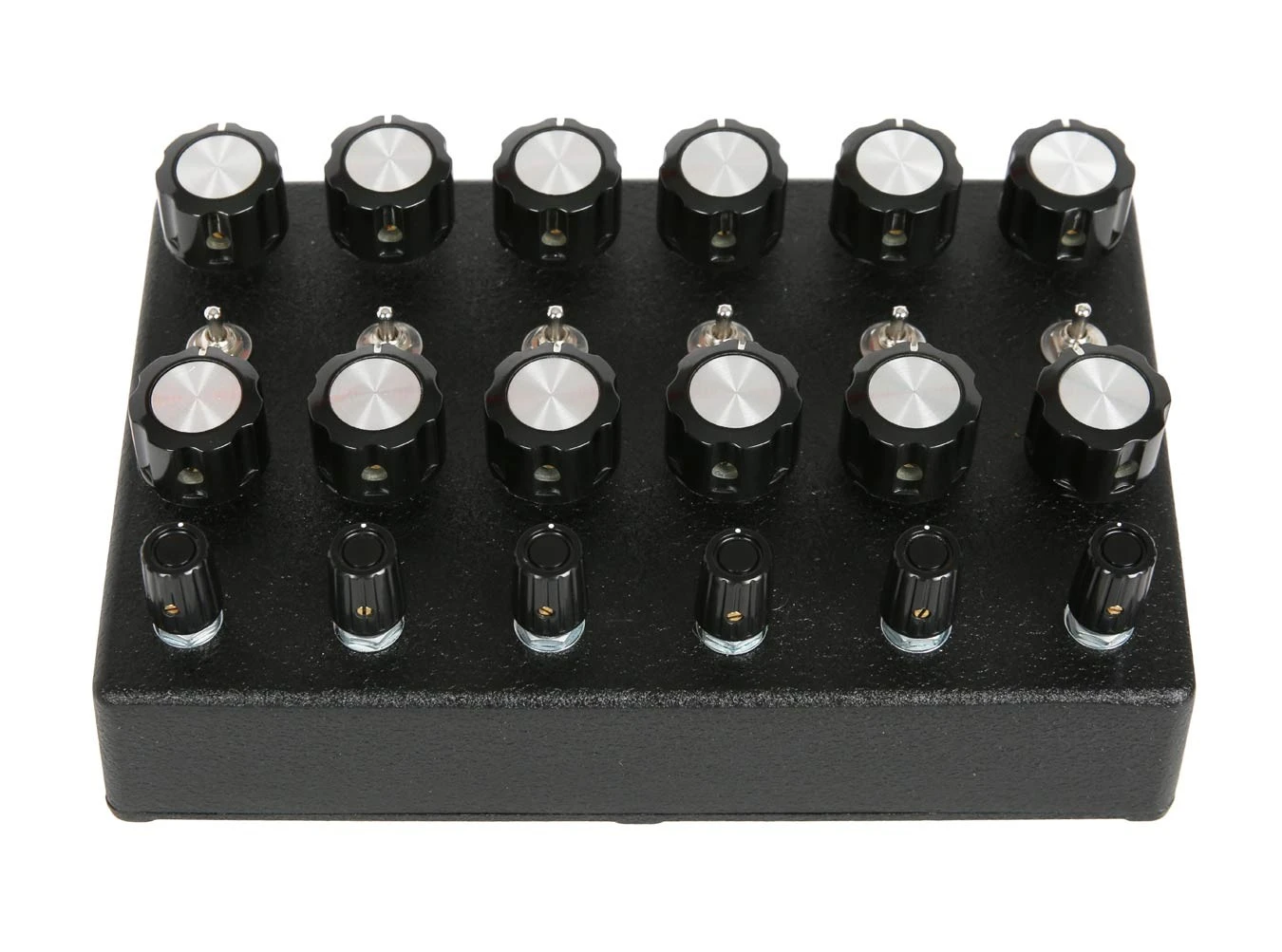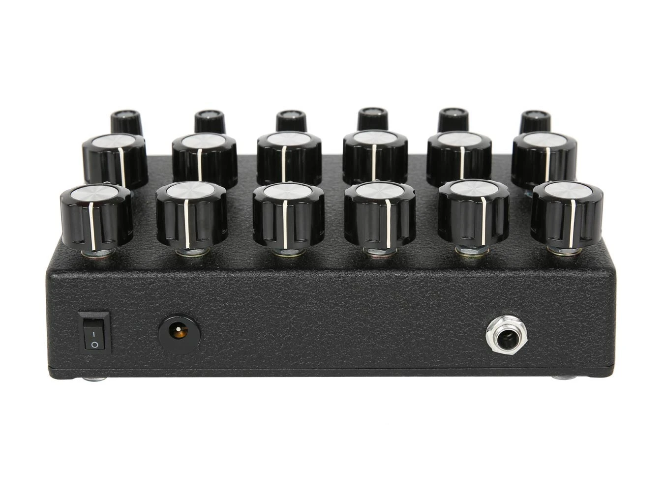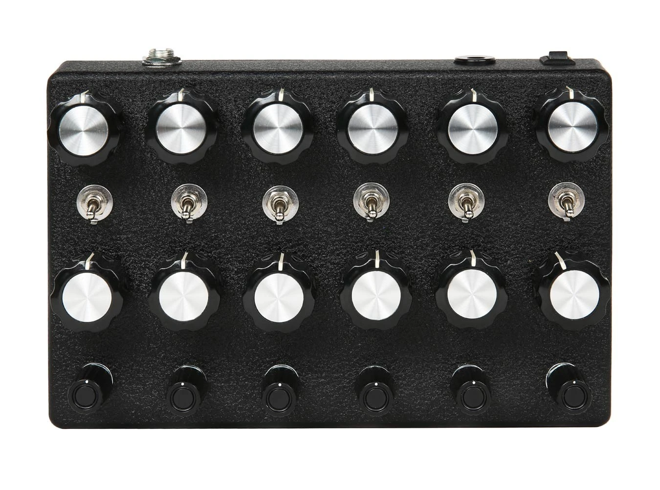 The NOSC-12, from JMT Synth, is a 12 oscillator drone synthesizer, six main oscillators with six sub oscillators. There are frequency controls for each of the oscillators, including the sub oscillators, which also include sync switches for each of the oscillator pairs. Each of the oscillators are mixed together to a 1/4″ output jack.