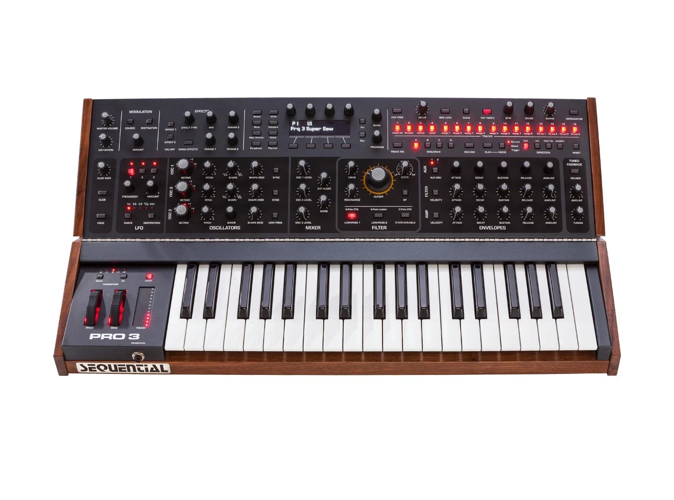 The Pro 3 also offers plenty of integrated performance controls. The three-octave keyboard offers velocity and channel aftertouch, while backlit pitch bend and modulation wheels and a position-sensitive touch fader provide several flavors of left-hand inflection. These combined with the fully-featured arpeggiator and 16-track, 16-step, 4-phrase sequencer make it such that you can play the Pro-3 in any number of ways: paraphonic sequencing, external CV, traditional keyboard control, and much more.
