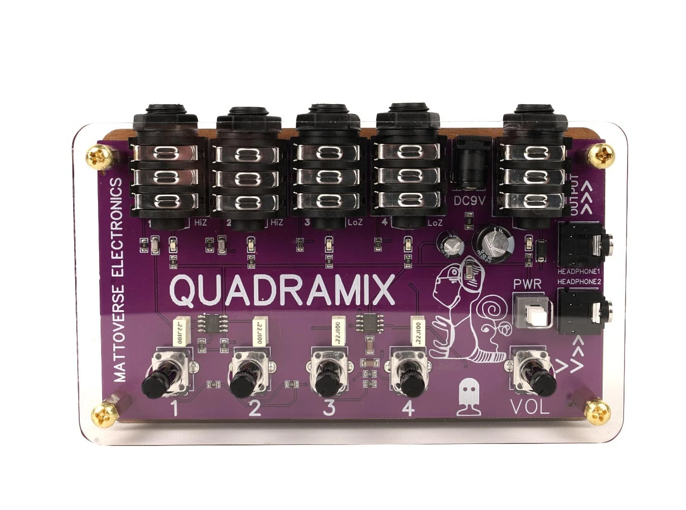 Mixers come in all shapes and sizes, and the Mattoverse QuadraMix is a 4-channel mono mixer sized to fit perfectly among an assortment of effects pedals and desktop synthesizers. The design is simple: two high-impedance inputs for instruments and two line level inputs allow you to sum guitar, bass, pedals, synths, drum machines, and more into harmonious sonic bliss. Each channel has its own volume control, and an output level colume is available as well. Send signals out from the 1/4″ output to your amp or audio interface, and use the headphone outputs for direct monitoring. Keep your instruments in check with the Mattoverse QuadraMix.