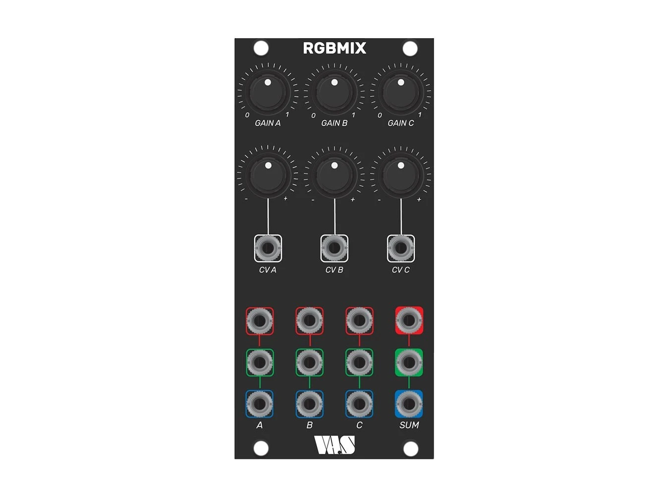 From Video Headroom Systems, RGBMIX is an essential utility for video modular systems, offering three channels of full RGB mixing. Use it to blend between different color sources, create weighted luma blends of modulation signals, or even create keyer configurations with the help of some extra modules. Channels A, B, and C all feature gain controls plus CV attenuverters, allowing your mixes to be dynamically modulated from control-rate, audio,rate, or video-rate signals. Drop a bit more mixing into your video rig with RGBMIX from VH.S.