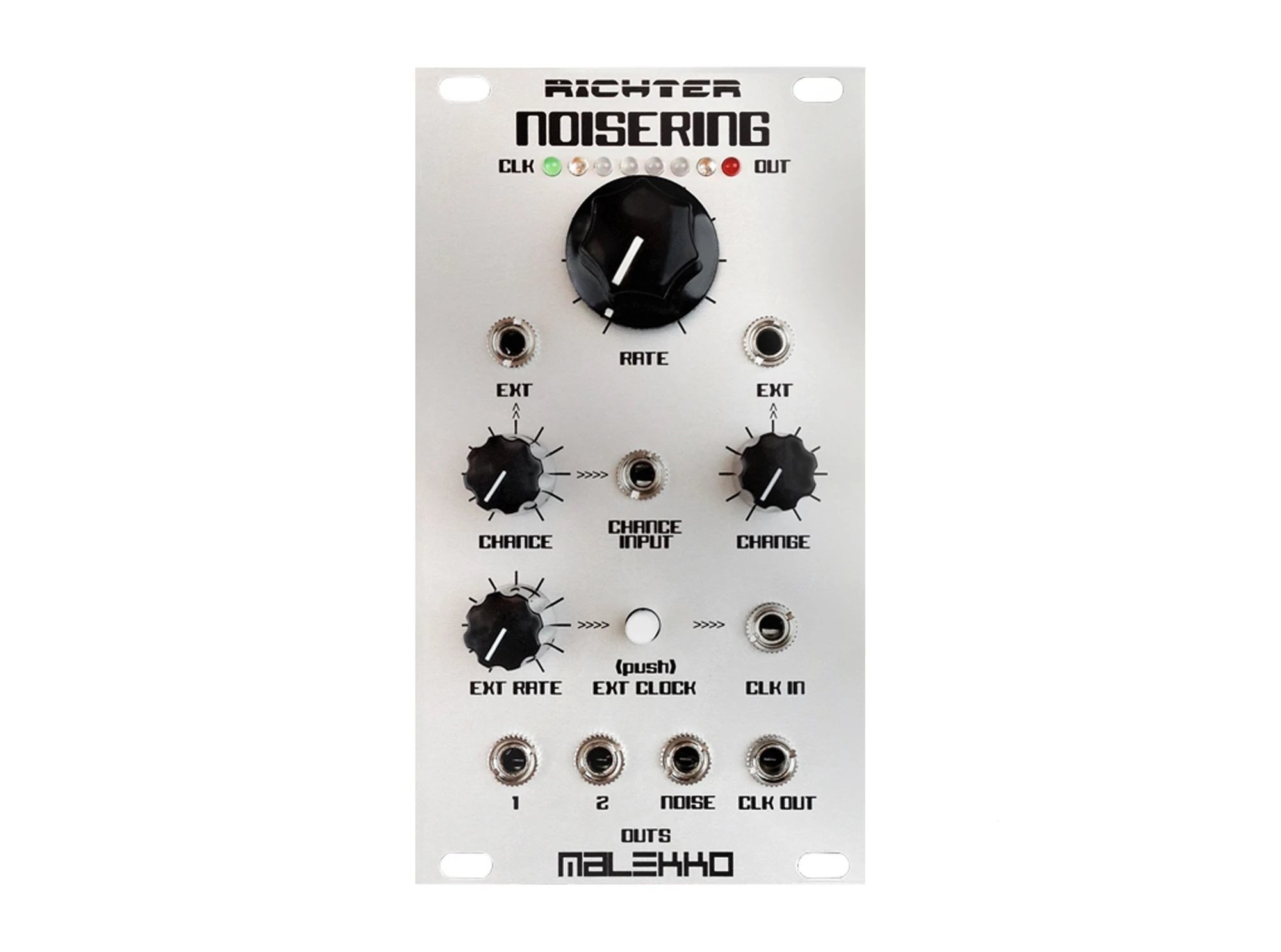 The Richter NoiseRing brings the Wiard Model 1210 to the realm of Eurorack modular synthesizers. The module is one of the most capable and powerful noise generators in all of Eurorack. It features a digital noise source, a pseudo random shift register, a clock input with dedicated rate control knob, clock and noise outputs, two random voltage outputs, and a chance input.