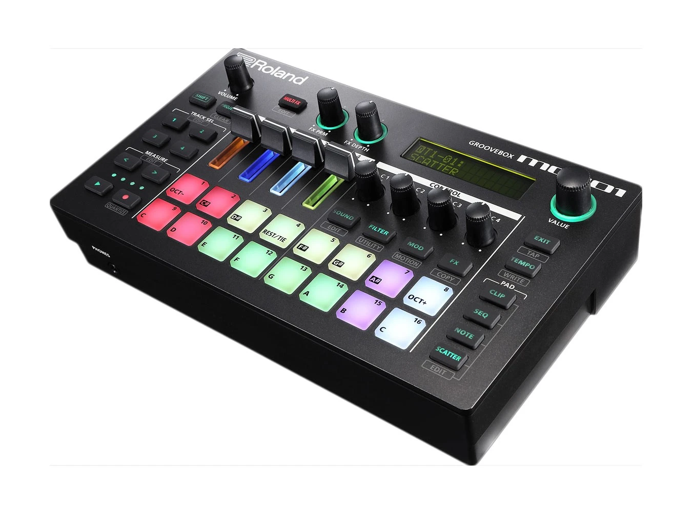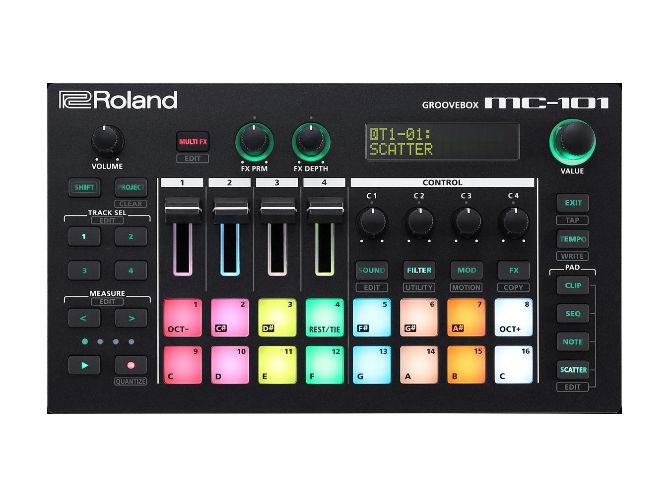 MC-101 is an ultra-portable groovebox from Roland that is powerful enough to handle production of complete tracks or to be used as an all-in-one performance tool. Essentially, MC-101 borrows much of its features and workflow from its bigger sibling MC-707. It contains a sequencer, polyphonic synth and drum engines, and a set of modern effects. Straight out of the package the groovebox comes with more than 3000 sounds covering all the bases from soft pads to piercing leads, 80 drum kits, and 90 custom DSP effects applicable to individual tracks and to Master channel. MC-101 utilizes clip-based sequencing, allowing for up to 16 clips per track. Besides playing sequences the tracks can be used for sample playback. Additionally, there is a built-in Looper with 4-voice polyphony, as well as pitch-shift and timestretch options.