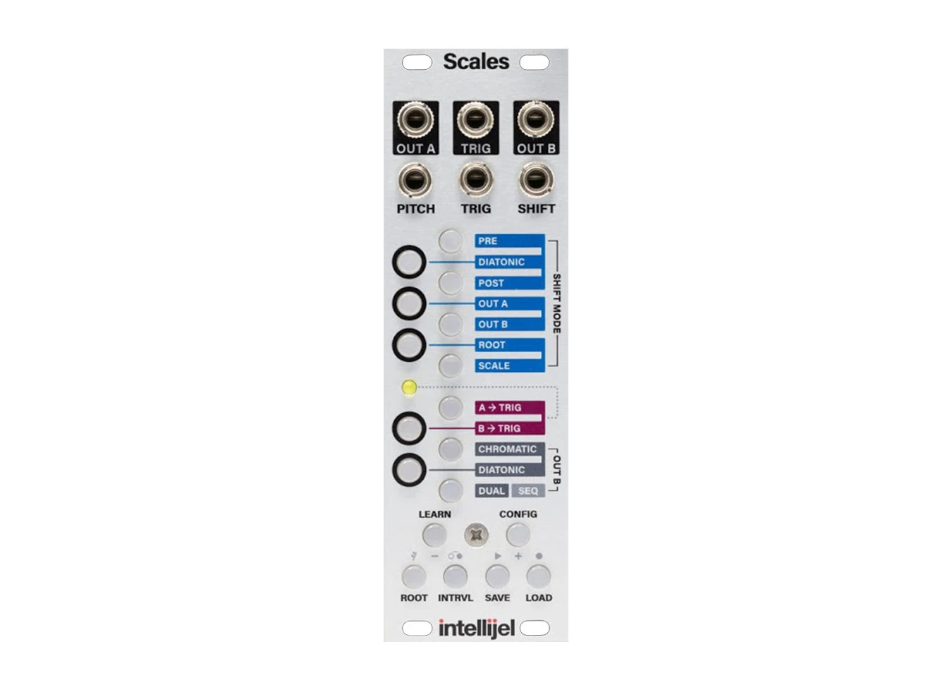 Scales from Intellijel is a dual-channel quantizer module for eurorack modular synthesizers. It accepts an input voltage and quantizes it to notational information within a user-defined scale. Use it as a pitch source for an oscillator or any other module that accepts note values.