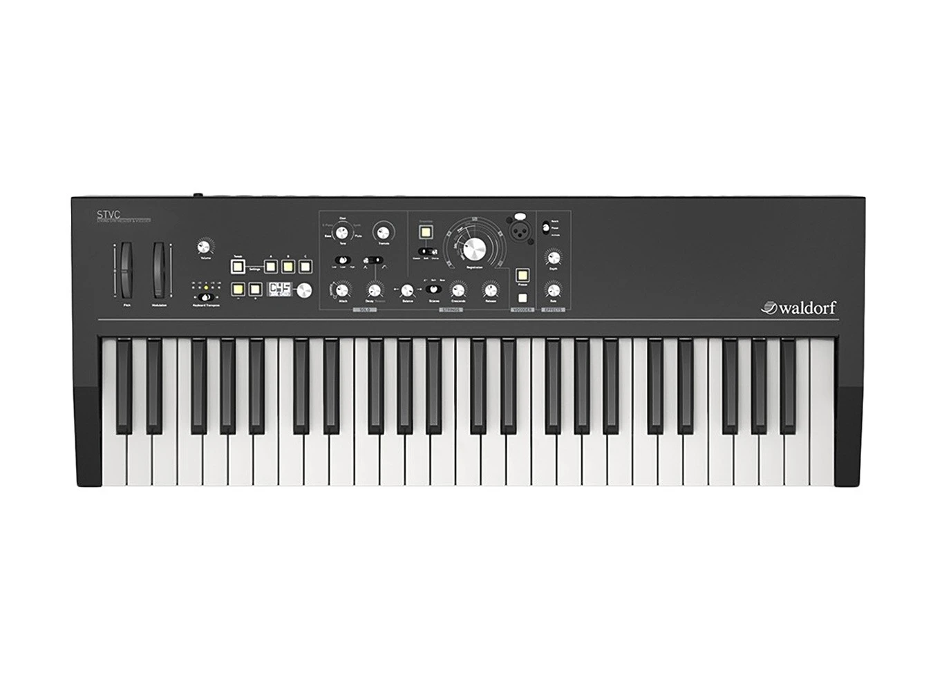 Waldorf’s Streichfett Keyboard (STVC) is a combination of a string synthesizer and vocoder with a unique flavor. It features a 49-note keybed with aftertouch, pitch bend, and modulation—all housed inside a rugged metal chassis. Its convenient OLED display gives unfettered access to 126 user-programmable patches spread across three banks. On top of all this, STVC features a powerful and intelligible vocoder with freeze mode, a polyphonic carrier, and gender modifier.