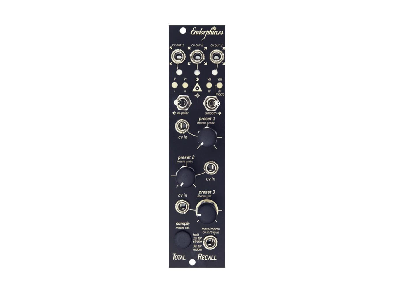 Total Recall from Endorphin.es is a three-channel preset manager and macro controller that adds easy recall of preset voltages to your fingertips. It features both a preset mode and a macro mode, which generate and process CV in different ways. In preset mode, you get access to a set of three CV levels, saved into eight slots, and presets are retained even when power cycled. These work as either unipolar or bipolar generators or processors—when using any of the three preset CV inputs, the knobs become attenuators or attenuverters, depending on the polarity switch. Select the active preset using the button, or use the meta modes to automate preset selection. Either scan presets with CV, or use a trigger signal to step through presets. The triggered mode either jumps immediately between presets or with a 100ms slew, set by the smooth switch. The macro mode allows you to define the minimum and maximum voltage levels for the three outputs. Preset knob 1 sets the maximum, preset knob 2 sets the minimum, and preset knob 3 moves between the two settings. These also work as CV processors with predefined level and polarity settings. Applying a CV signal will transition between the minimum and maximum levels, and a trigger input will jump from minimum to maximum with an optional 100ms slew. Total Recall is an indispensable live performance tool, giving you direct and dynamic control over predefined settings.