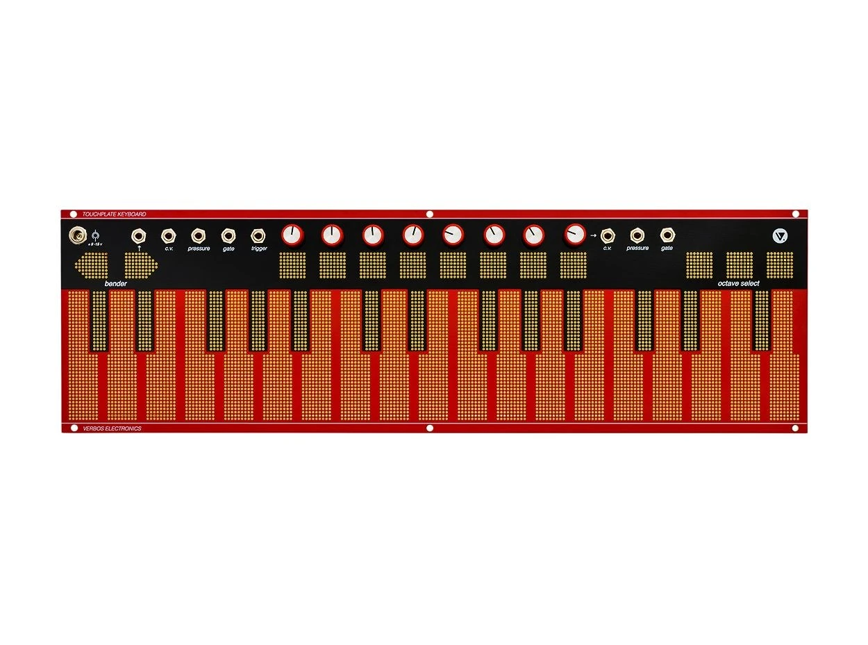 The Verbos Electronics Touchplate Keyboard is a Buchla 218-inspired keyboard controller module optimized for use with Eurorack modular synthesizer systems. The module is comprised of three separate sections geared towards the generation of control voltages. First, there’s the obvious 32-note volt/oct piano with three octave selections and CV pressure control. There’s a CV pitch output, as well as outputs for a gate and a 10ms trigger. A pressure-sensitive up/down bender can be used to bend a variety of parameters, depending on how it is patched. Finally, there’s an 8-note tunable touch selector keyboard with gate outputs and CV pressure control.