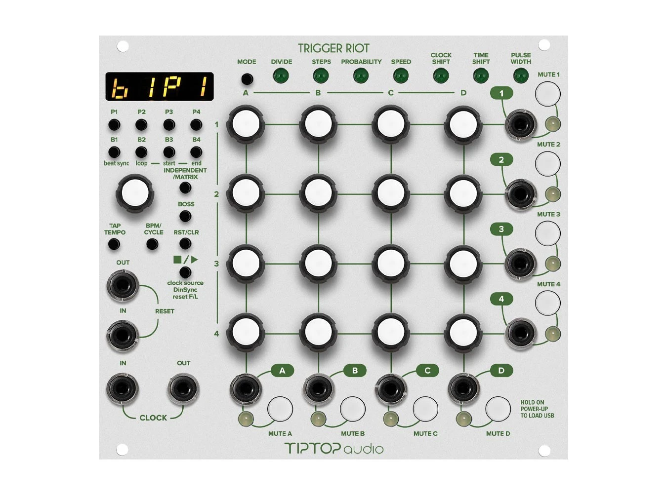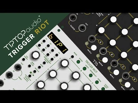 The Tiptop Audio Trigger Riot is a source of complex gate and trigger signals, providing deep clock sequencing possibilities with eight outputs. It features a matrix of knobs whose settings affect the output jacks in both the rows and columns. These can set everything from clock division to probability to pulse width of the gate outputs. Adjusting an encoder sends its setting both vertically and horizontally, and is added to the status of the other encoders in the row or column. Outputs can also be muted on the fly, which adds another level of performability. The settings of the Trigger Riot can be saved in non-volatile memory for easy recall. Complex and interrelated gate sequences with an interface that promotes performance is what Trigger Riot excels at.