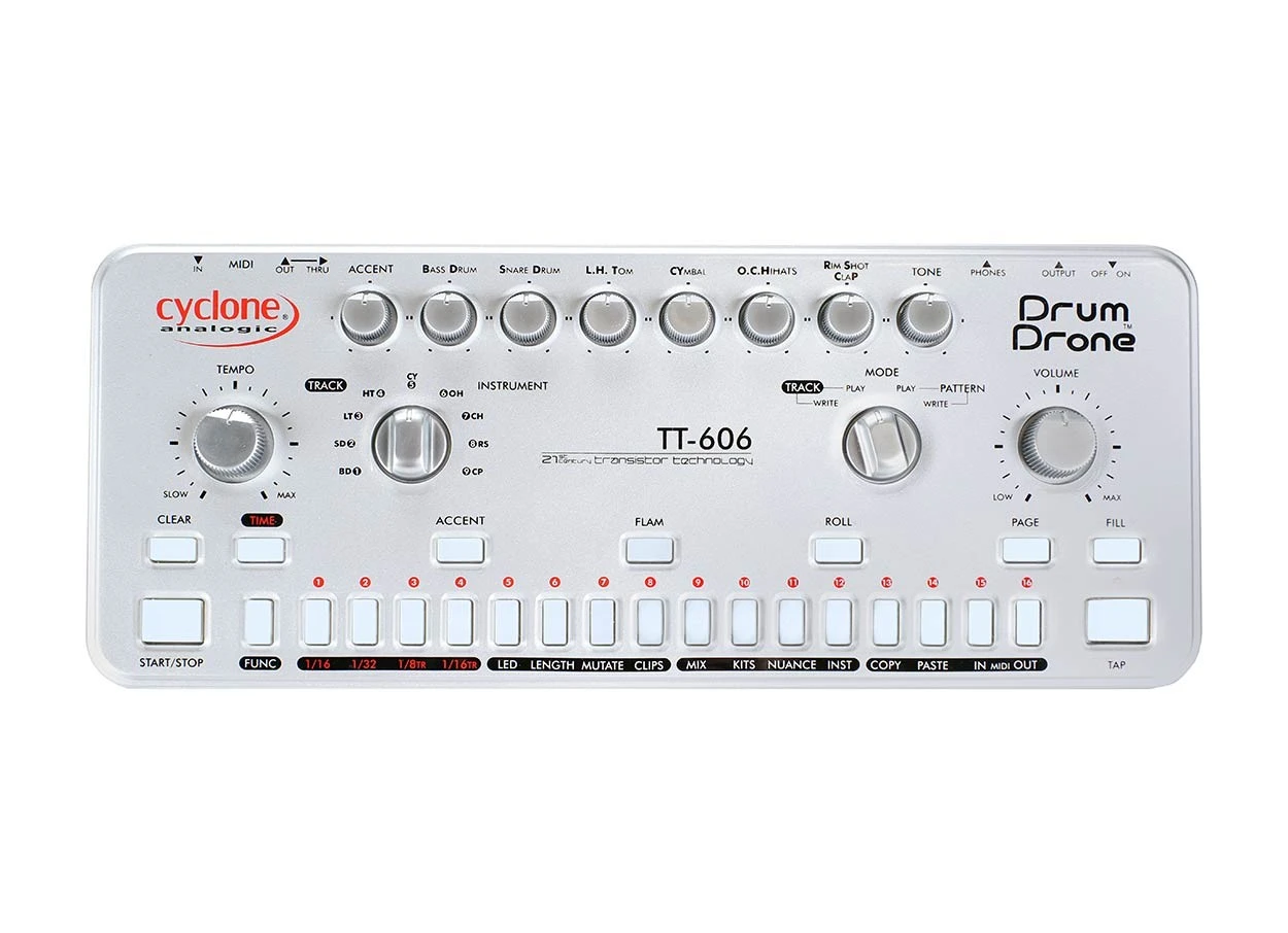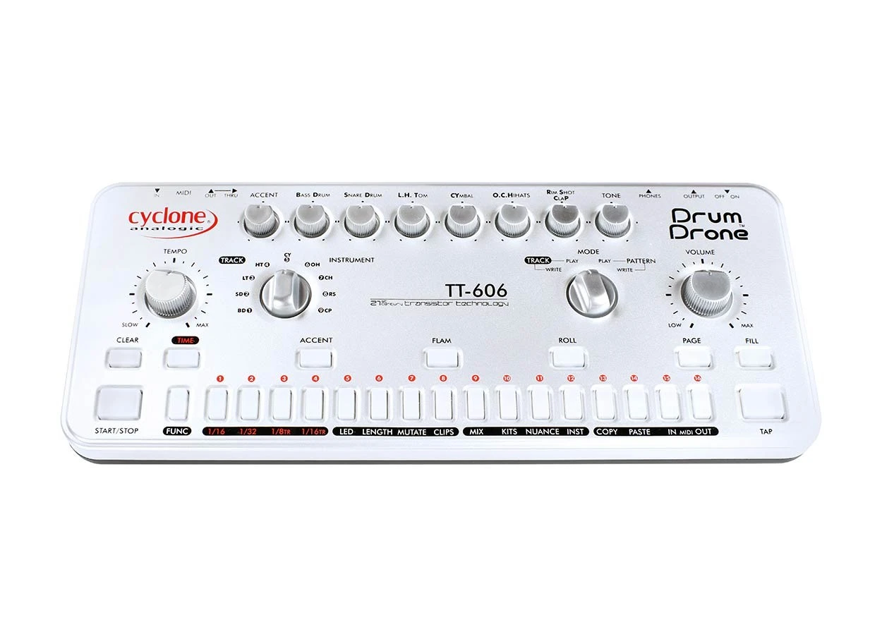 The Cyclone Analogic TT-606 Drum Drone is a modern recreation of the legendary Roland TR-606 Drumatix. Like its predecessor, the TT-606 is completely analog and features the classic front panel interface. However, unlike the Roland unit, the TT-606 features individual outputs per sound. There’s also a MIDI IN/OUT, headphone jack, and amplifier send for convenient routing and monitoring.