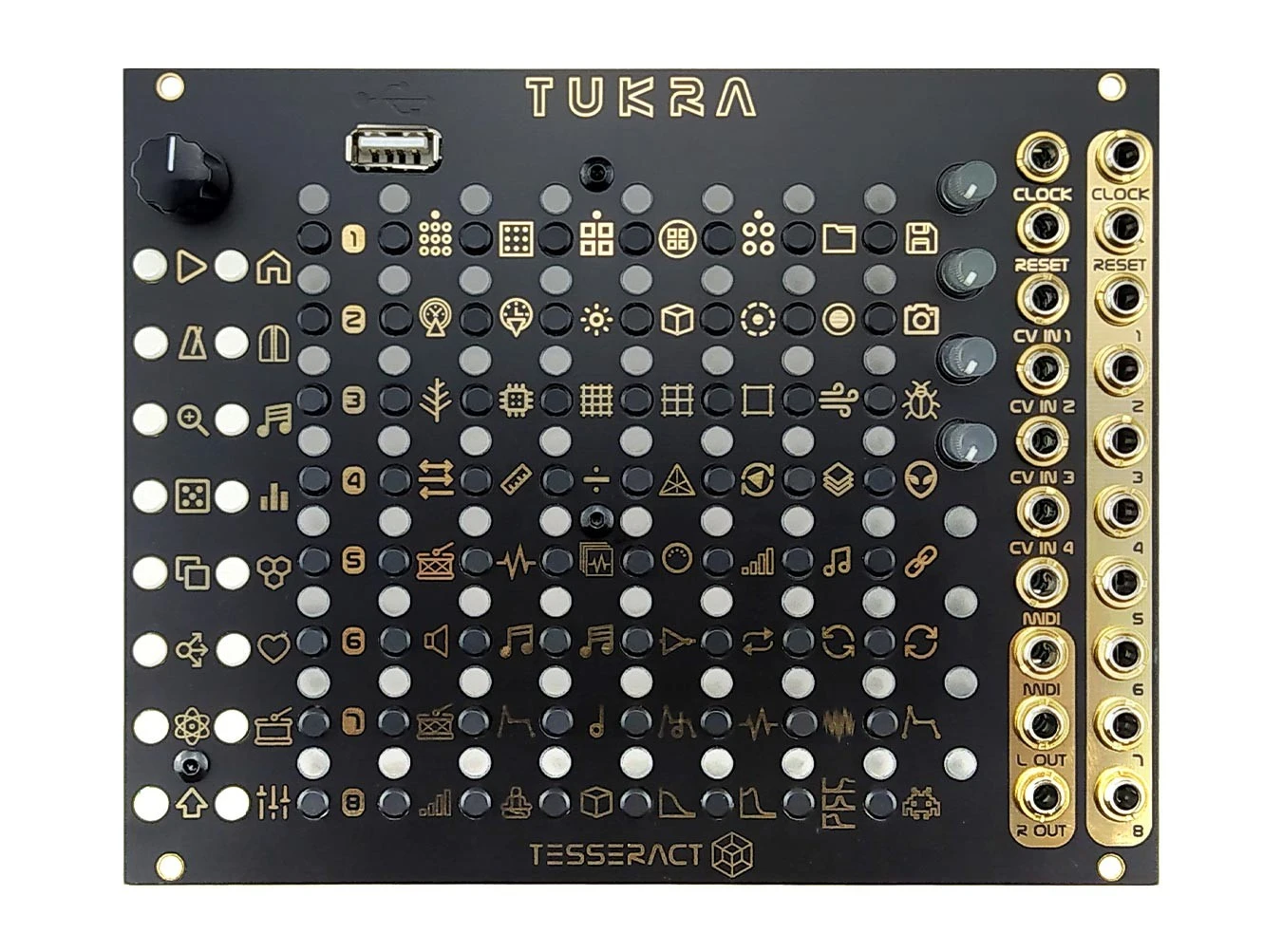 TUKRA from Tesseract Modular is a feature-rich 8-channel trigger sequencer, and all-in-one drum machine designed to easily integrate with both CV/Gate and MIDI gear. The architecture of this sequencer/drum-machine allows users to program long, multi-part sequences or even complete songs. Sequences up to 64 steps in length can be chained together into 64 patterns, which can be further organized across 64 parts, and 16 songs within a single project. Up to 64 projects can be hosted on an SD card. Each sequencer track and each pattern allows for independently configurable play mode, clock divider, length, and choke settings. Add to this user-definable probability settings over step, gate, roll, micro-grid step editing, euclidean generator, plus a unique generative sequence tool ramifications, and you’ve got an unfathomable amount of options to construct elaborate and complex rhythmic structures for days.