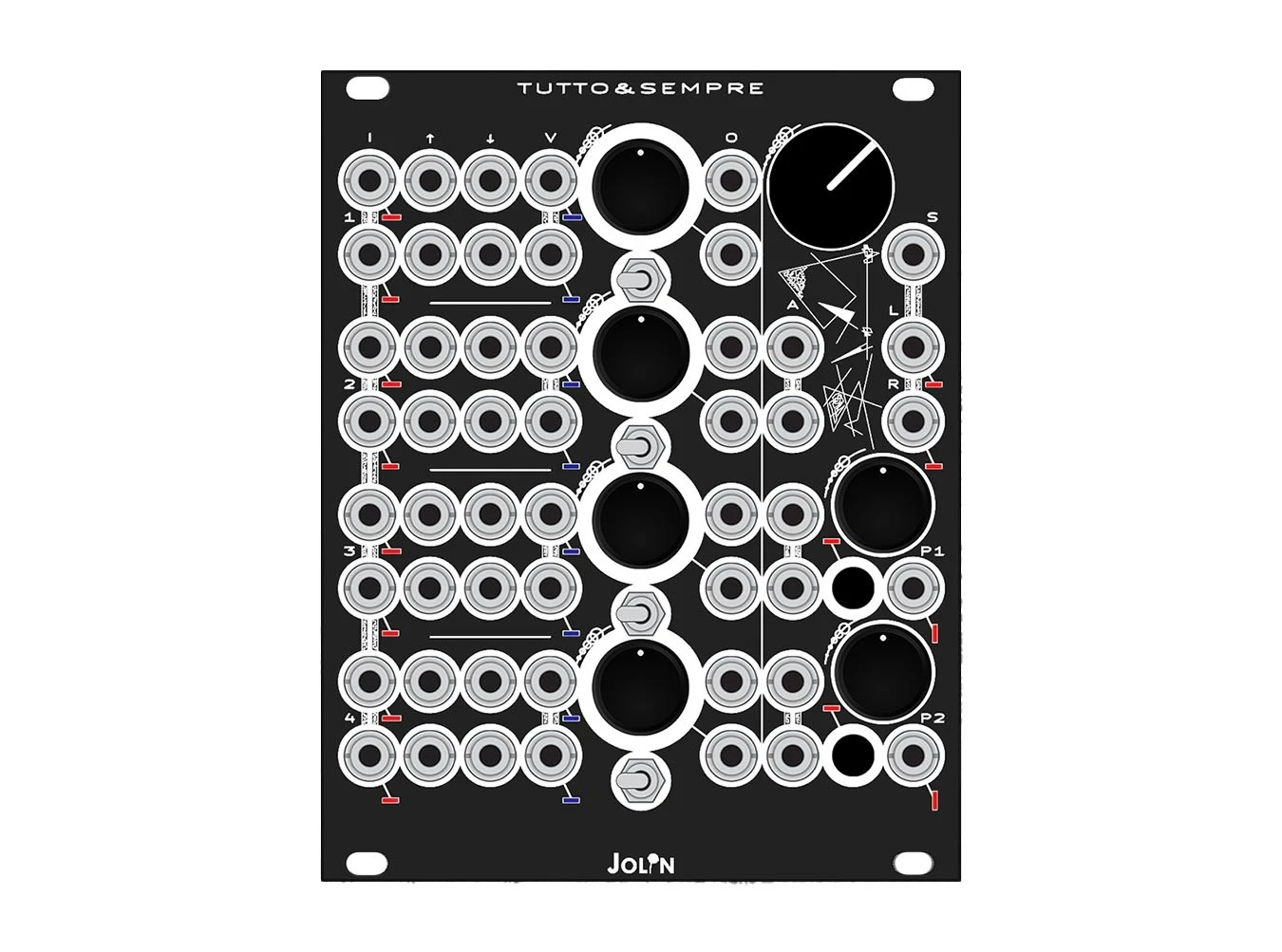 Tutto & Sempre is Jolin’s Endgame Mixer that offers a built-in patchbay, four stereo VCAs, and two headphone outs making this an incredible option for tucking everything in. Each channel has a pair of inputs that are normalized, independent VCA CV inputs, and a patchbay that works like a send/return path. The output section features three stereo Aux inputs that bypass the mixer section, two high quality 3.5mm headphones drivers with dedicated volume, a pair of balanced L and R outputs, plus a combined 3.5mm stereo output, designed to go straight into audio interfaces. Tutto & Sempre, Italian for Everything Always, is truly a fully equipped 4 channel mixer that completes your modular system and buttons all audio up in a satisfying way.